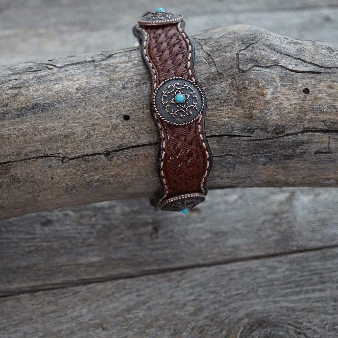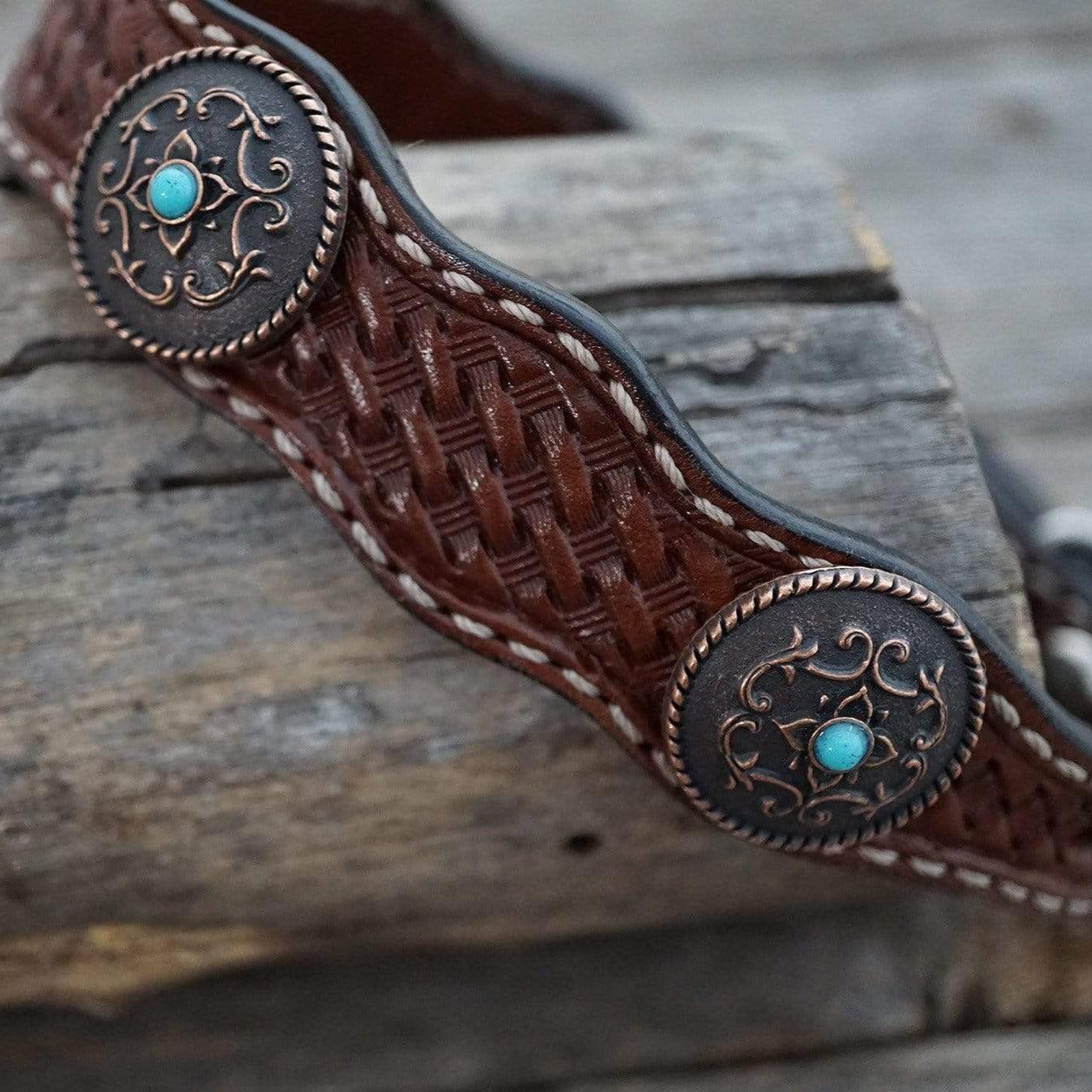 Handmade leather medium oil dog collar with basketweave tooling. Decorated with four copper floral turquoise conchos.