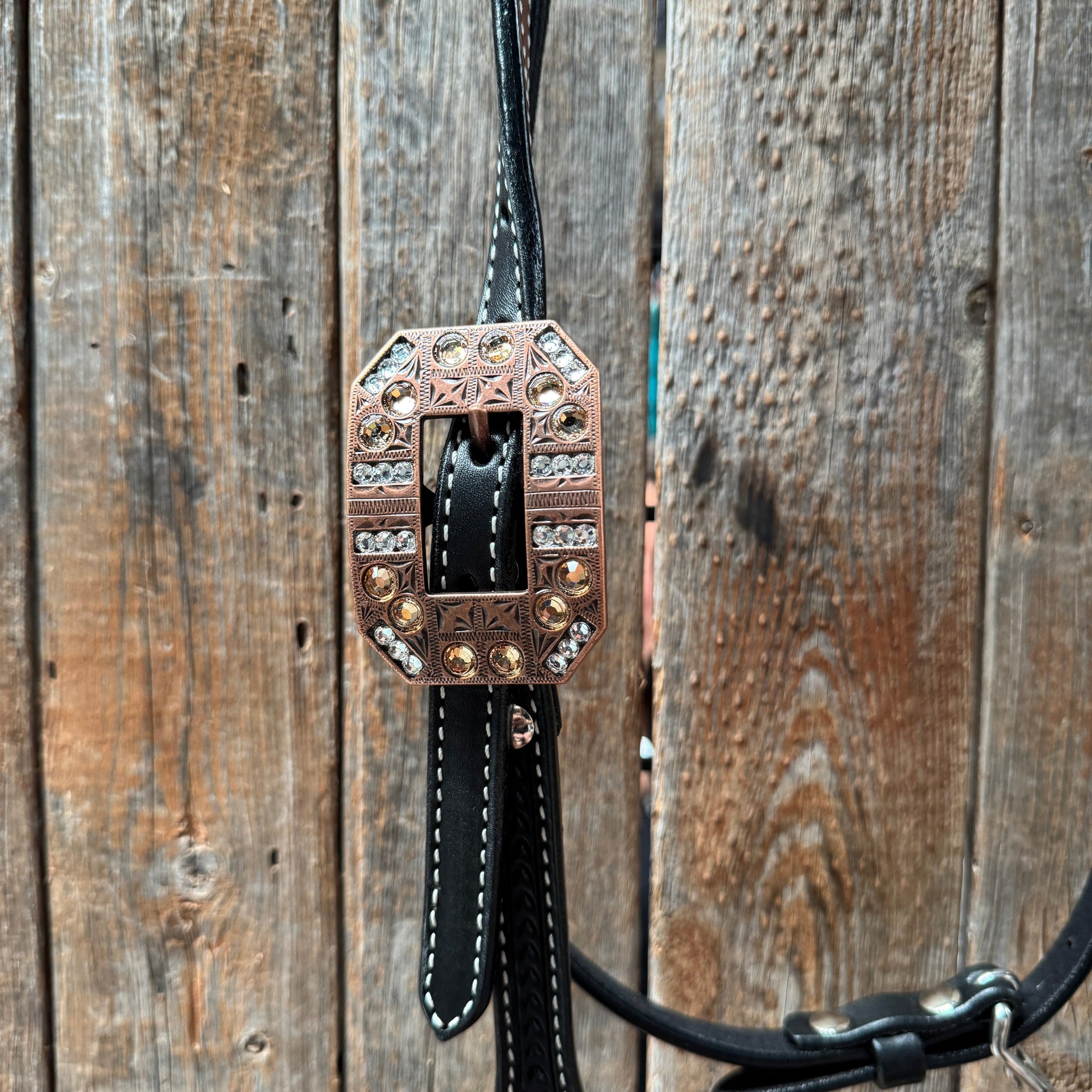 Browband is black basketweave. Decorated with copper Champagne/Clear crystal conchos/buckles.