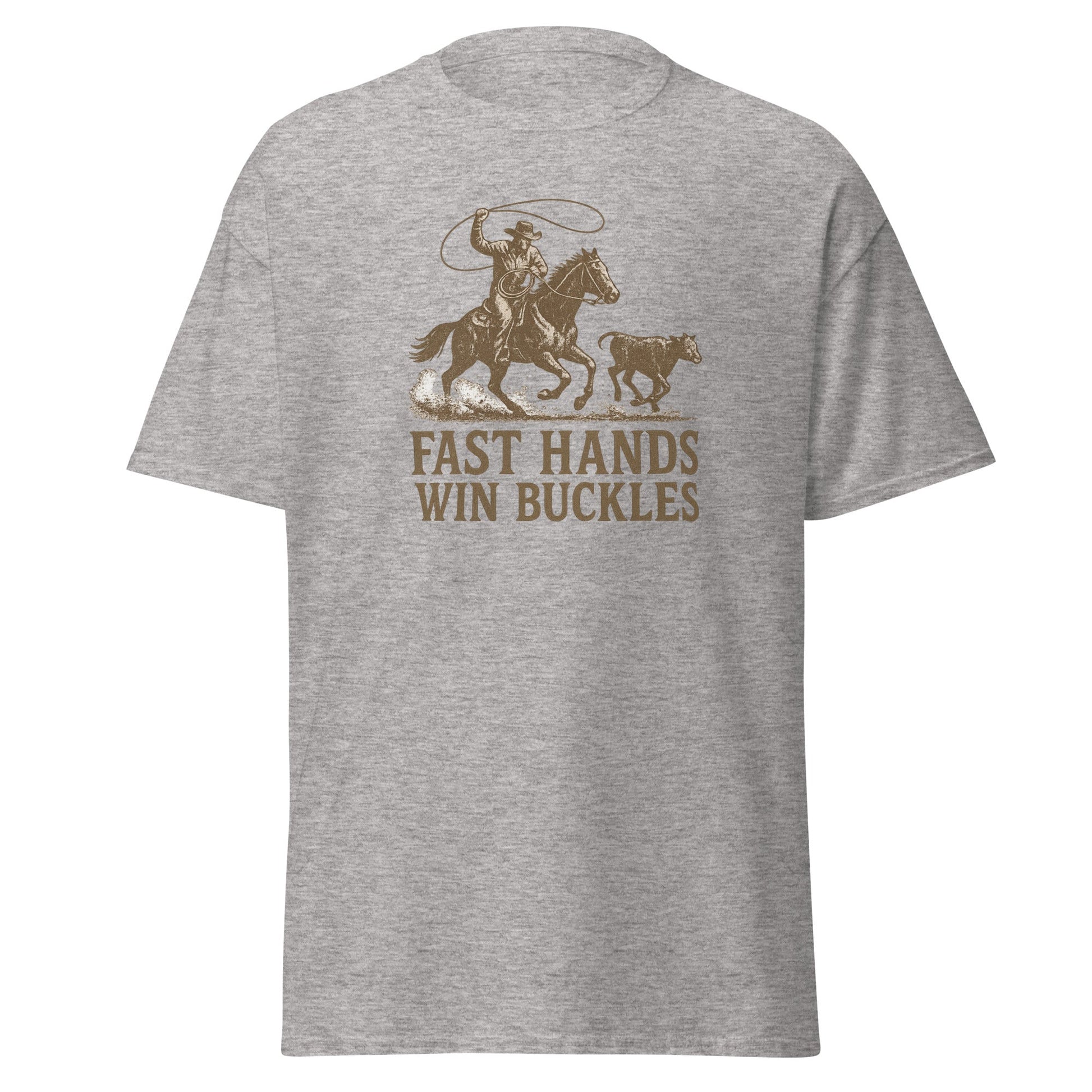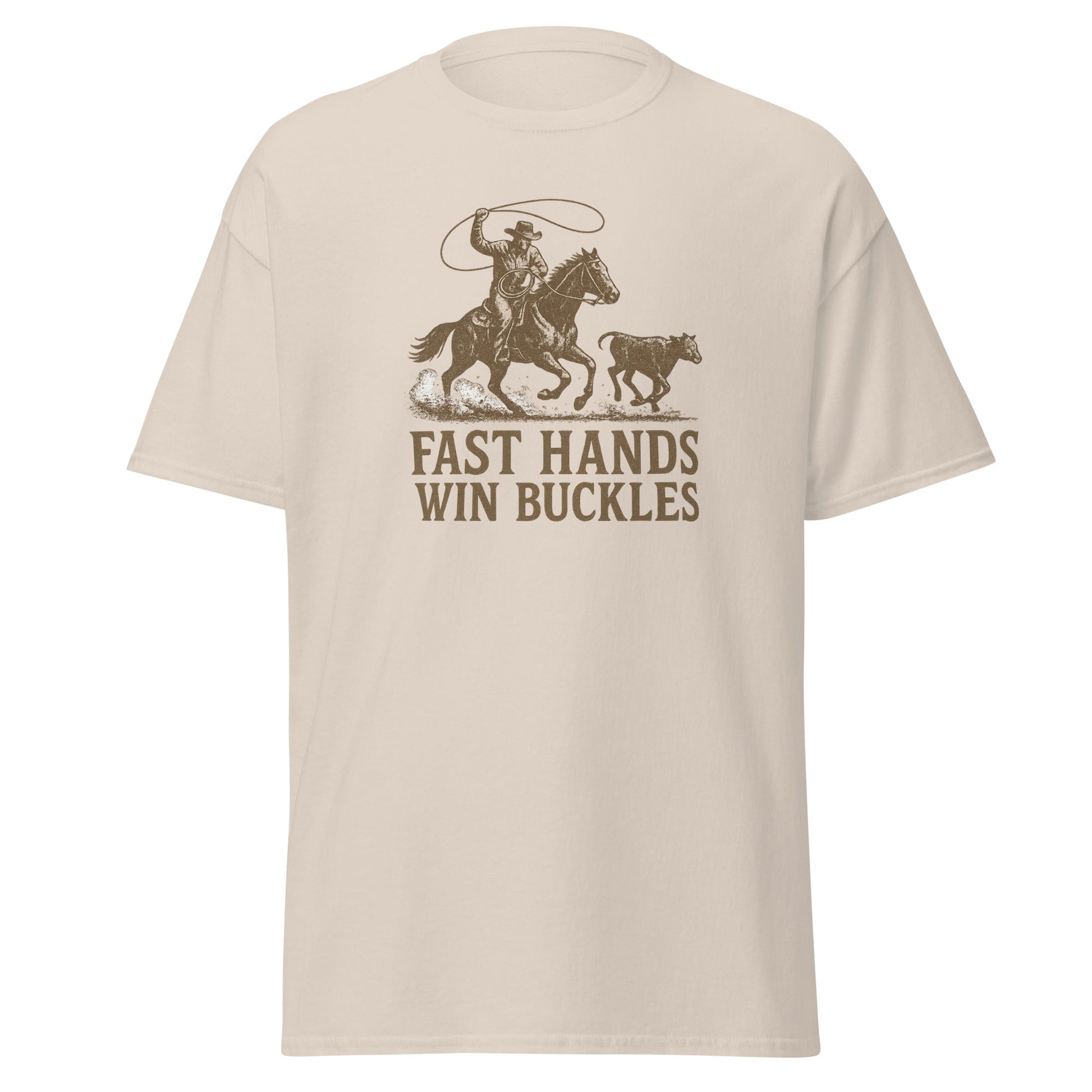 💥 Striking “Fast Hands Win Buckles” graphic with vintage rodeo flair