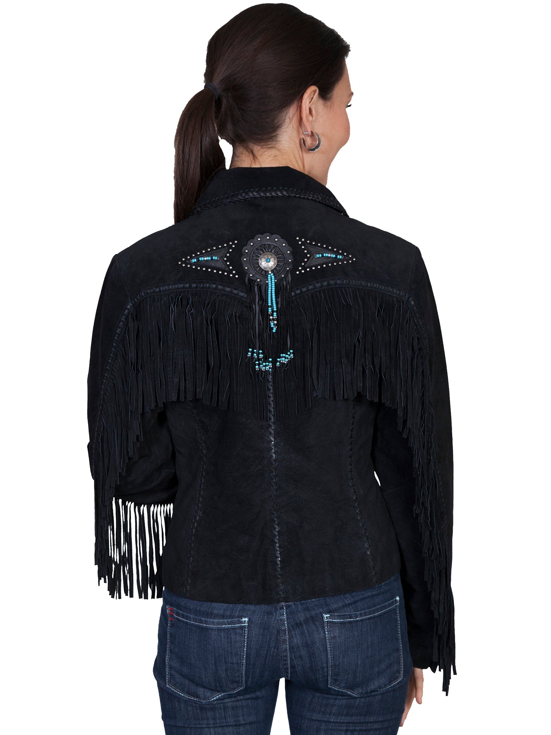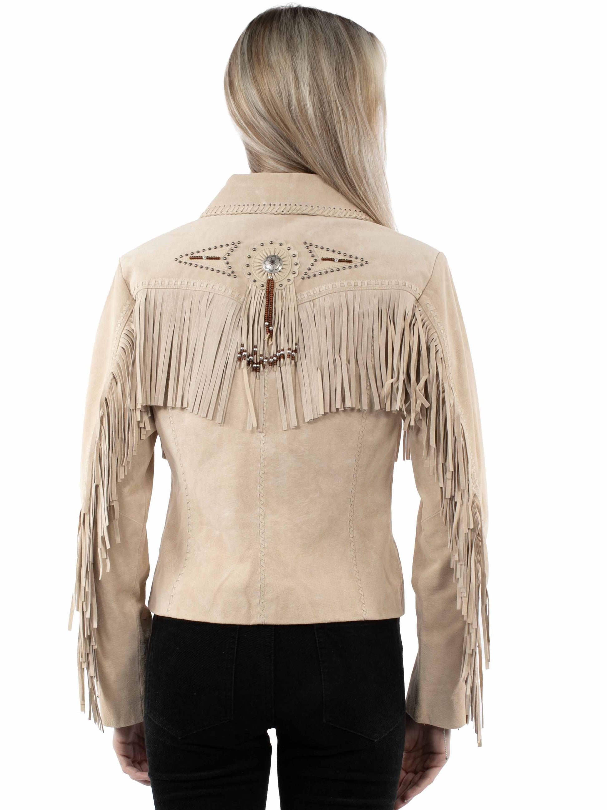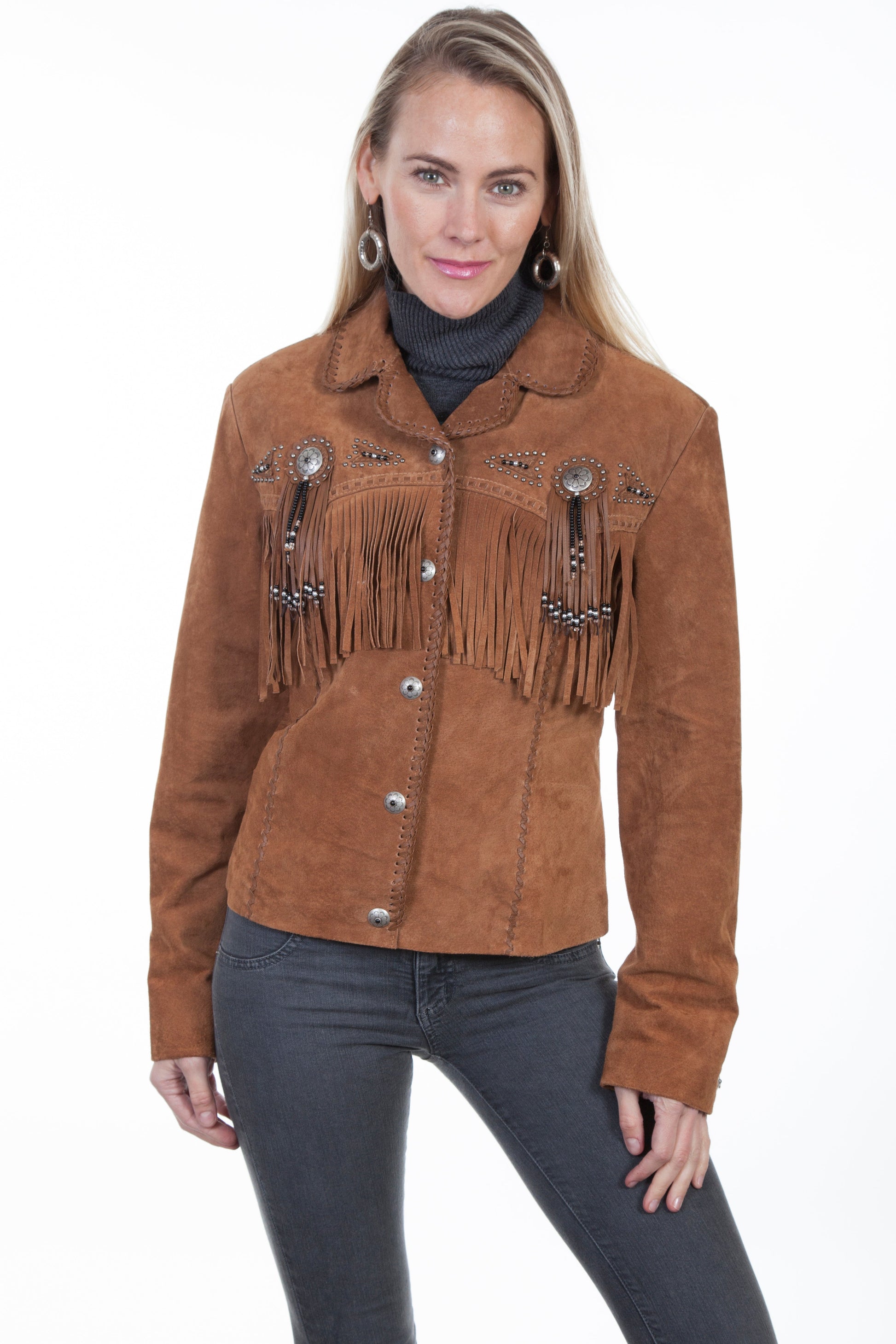 Fringe and beaded jacket. This classic western jacket has a flattering fit. It features fringe yokes front and back and down the sleeves. This western design features conchos with beaded fringe and stud and bead design detail. Lined. Import.
