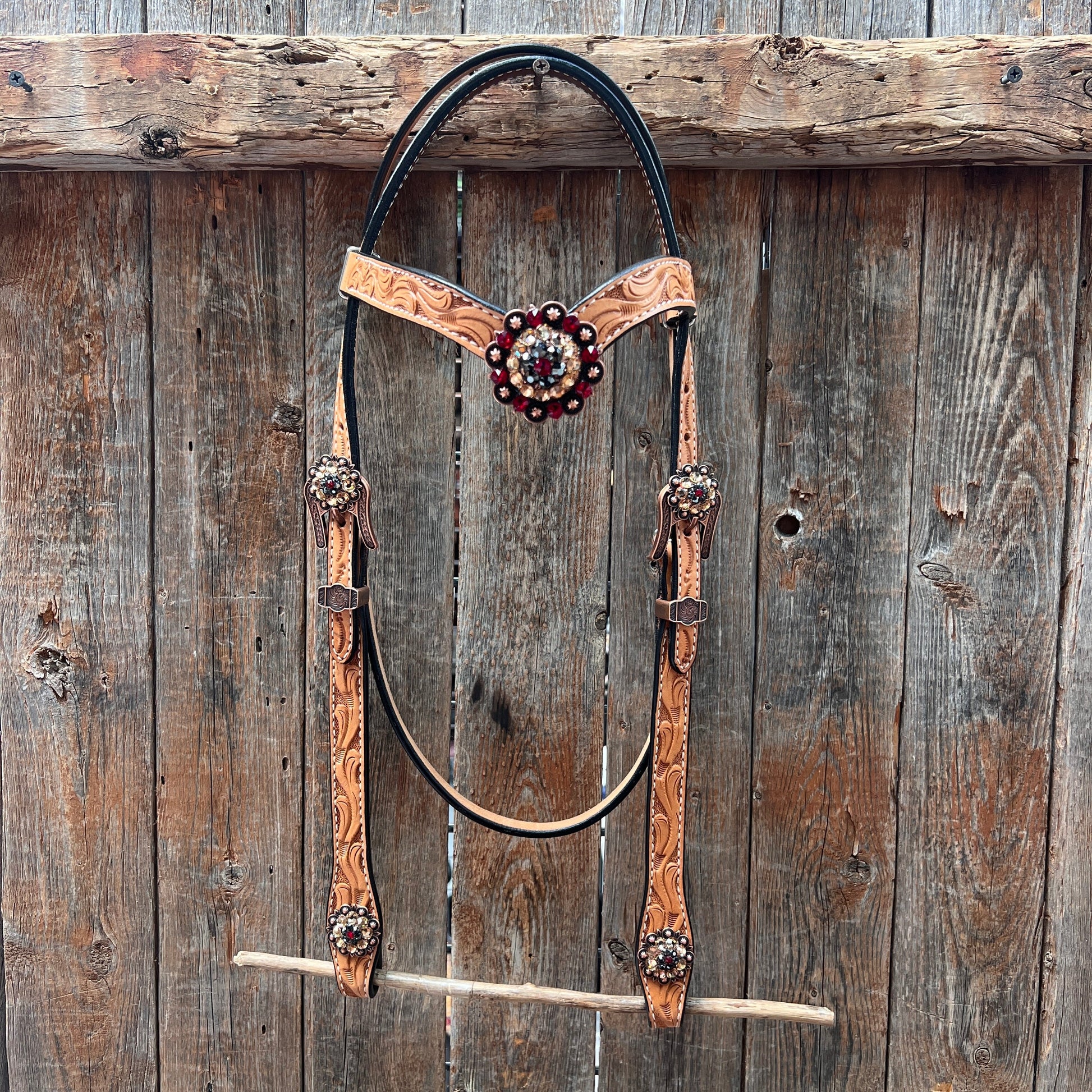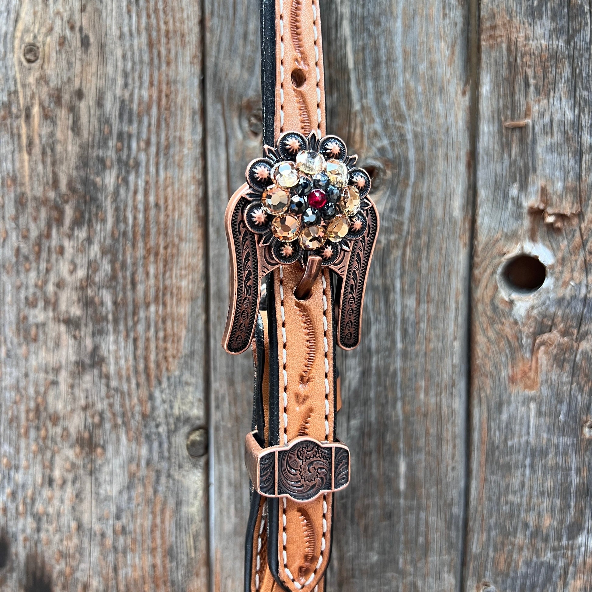 Browband in light oil floral v-brow style. It is decorated with copper Ruby/Jet/Champagne conchos/buckles.
