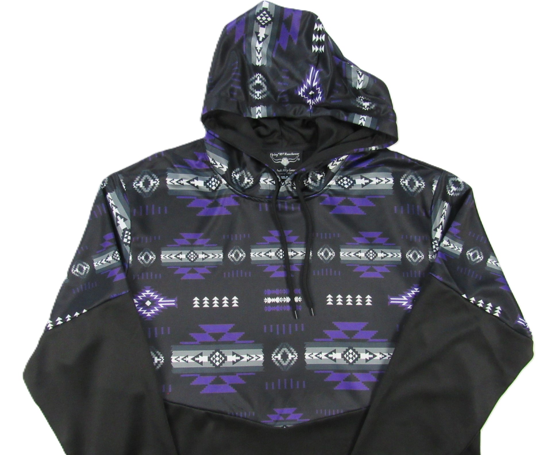 Our new thermal hoodie is long enough to keep the cold air from sneaking up your back. Perfect for tailgating or hiking. It's long enough to keep cold air from sneaking in and light enough to wear all day. Made with performance poly that breathes while keeping you warm. Long sleeves and a drawstring hood complete the styling. True to size, if you wear a large, order a large. Printed in a current southwest motifs in purple/gray/white on a black solid. Flying R Ranchwear Machine washable, 100% polyester. Imported