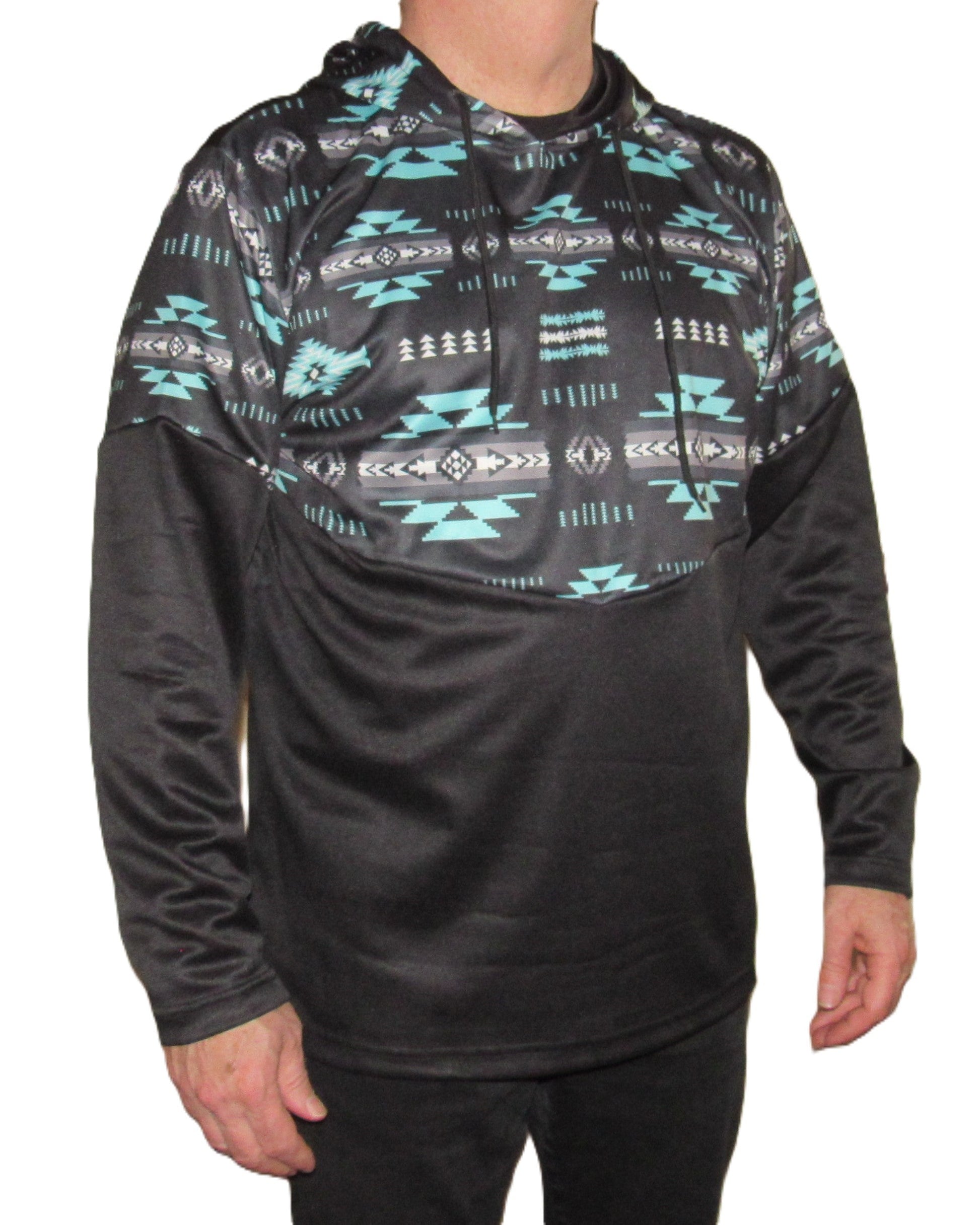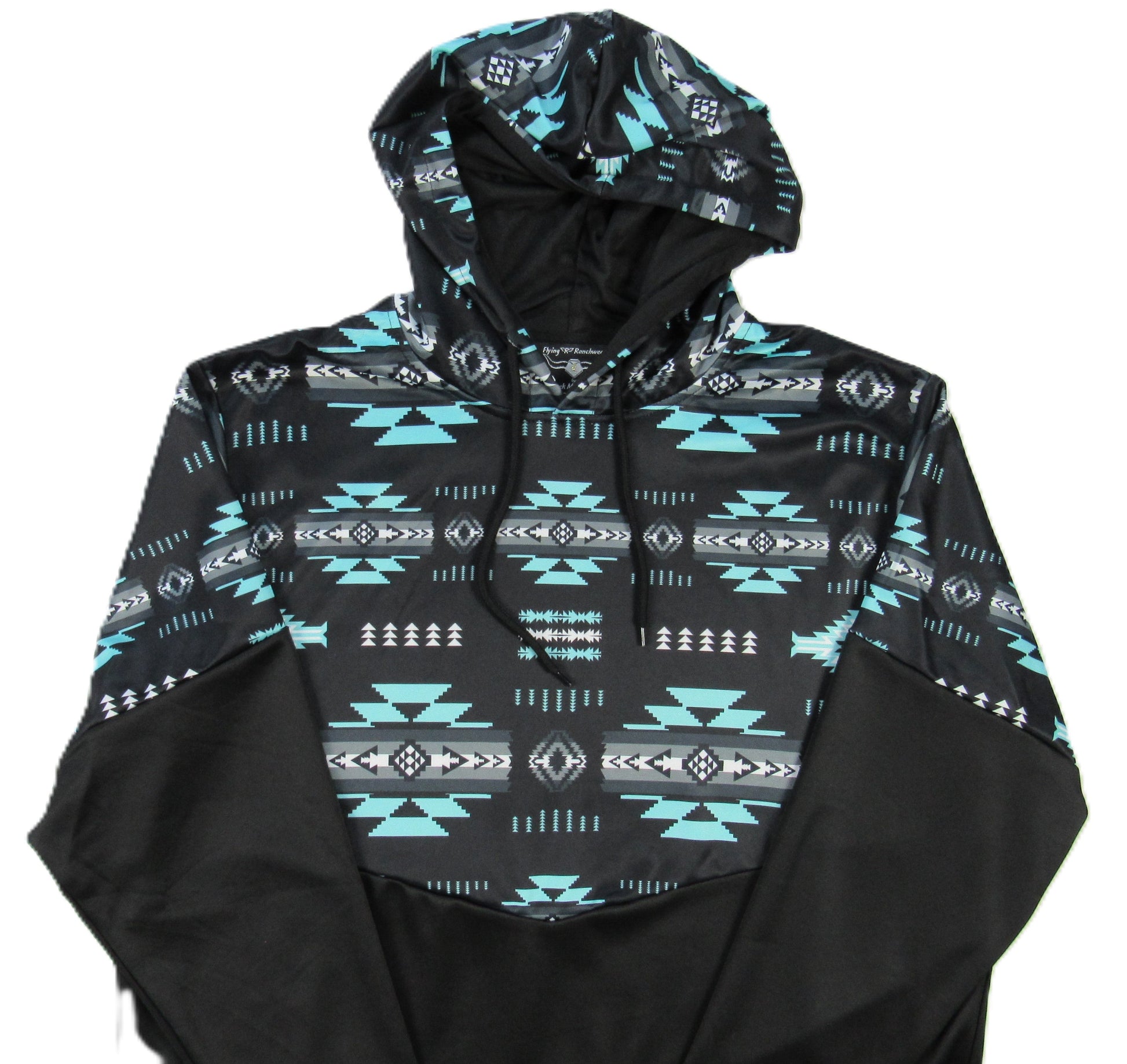 Our new thermal hoodie is long enough to keep the cold air from sneaking up your back. Perfect for tailgating or hiking. It's long enough to keep cold air from sneaking in and light enough to wear all day. Made with performance poly that breathes while keeping you warm. Long sleeves and a drawstring hood complete the styling. True to size, if you wear a large, order a large. Printed in a current southwest motifs in turquoise/gray/white on a black solid. Flying R Ranchwear Machine washable, 100% polyester. Imported
