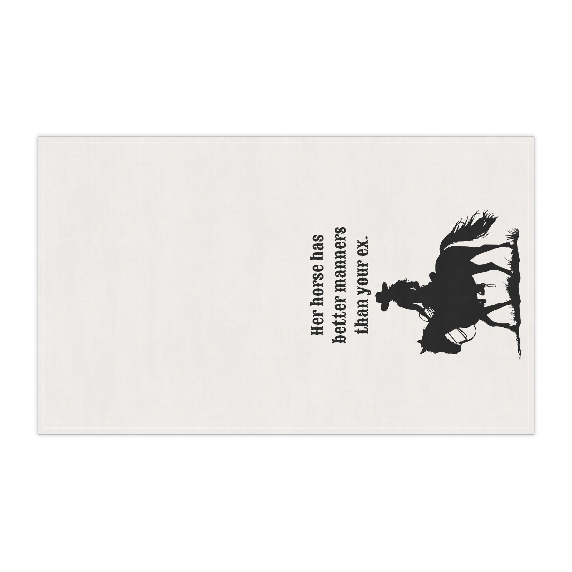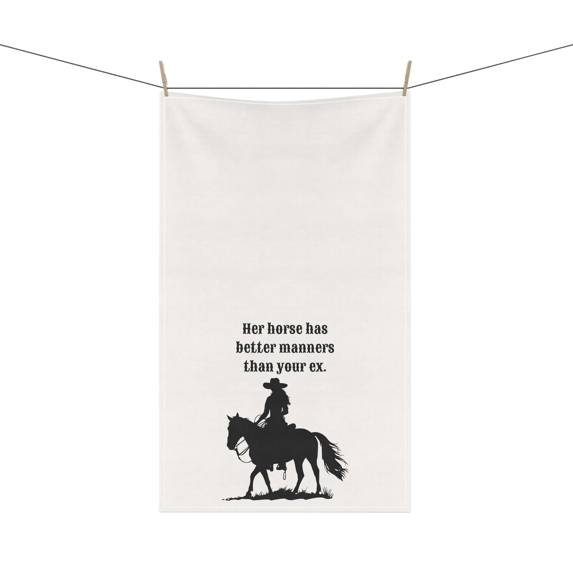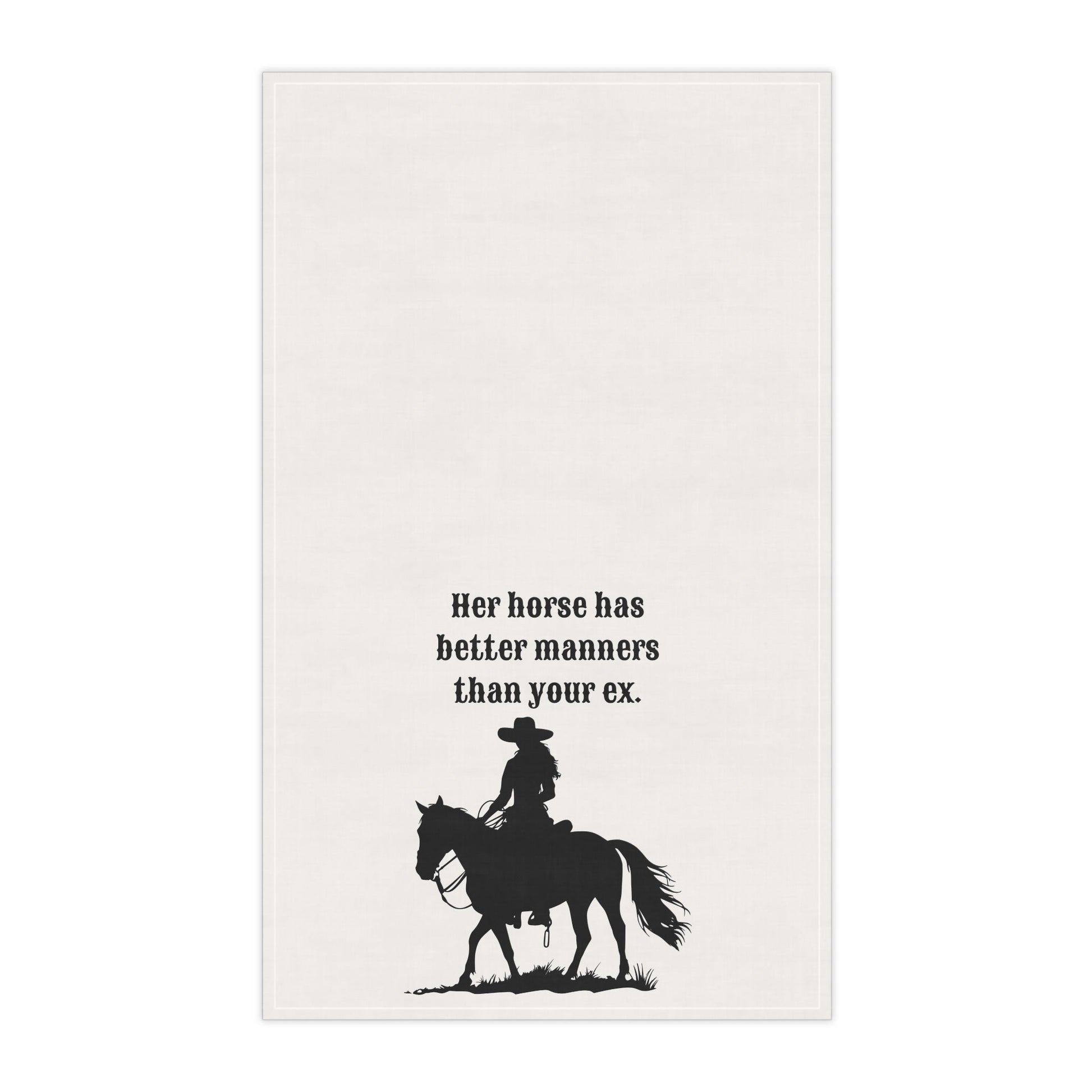 Add a touch of humor and sass to your kitchen with this tea towel featuring the design 'Her horse has better manners than your ex'. Perfect for horse lovers and anyone with a witty sense of humor, this tea towel is a great conversation starter. Ideal for everyday use in the kitchen or as a fun gift for birthdays, holidays, or housewarmings.