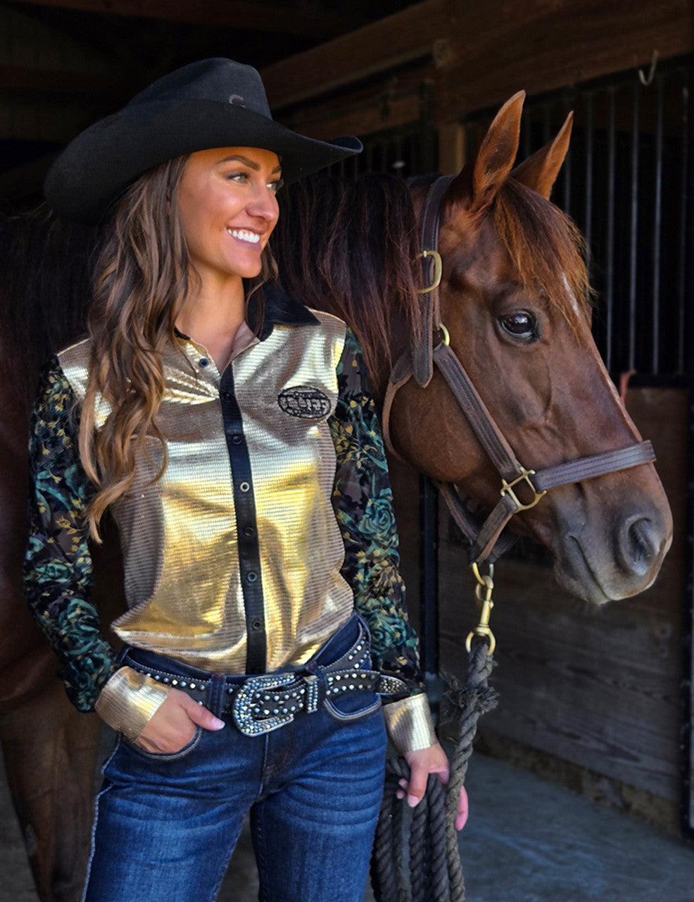 The “ORIGINAL” Pullover Button Up was invented by our Owner and Designer Lisa Bollin in 2018 after being so frustrated when getting her buttons hooked on the horn and popping her shirt open during a competition run. While designing this incredible shirt she made sure to add a longer back tail to stay tucked in, longer arm length for reaching and only using the highest quality stretch fabrics. The no-gapping front button placket has three functional buttons for easy on-and-off and six faux buttons that create the appearance of a classic button-down and so flattering. They are FUNCTIONAL and THE SAFEST SHIRT YOU'LL EVER WEAR COMPETING.