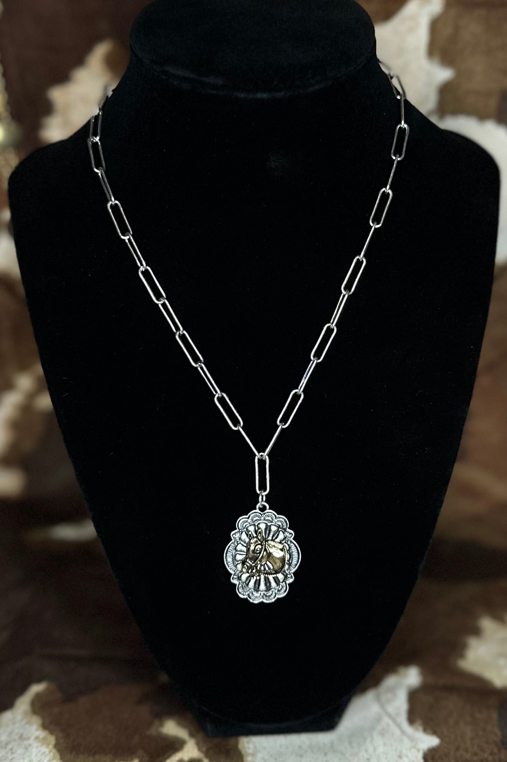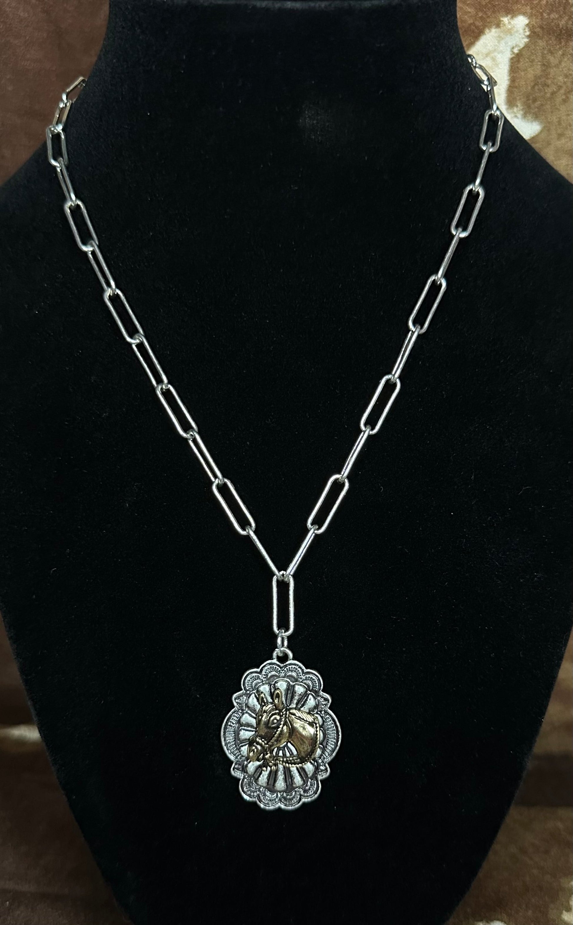 Saddle up with timeless style. This handmade necklace features a sleek silver paperclip chain secured with a sturdy silver lobster clasp, making it both durable and effortlessly chic. The star of the piece is a beautifully detailed silver and gold horse pendant, capturing the spirit of the West with a graceful, rustic flair.