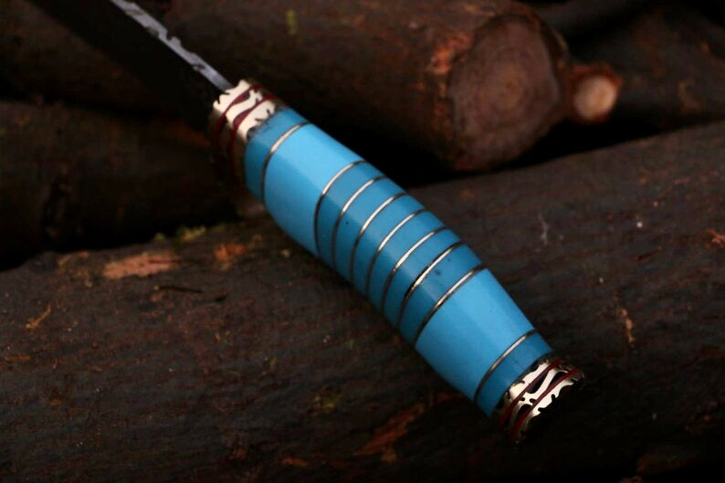 Meticulously forged by hardworking artisans, this exquisite blade is a marriage of ancient craftsmanship and modern aesthetics. The Damascus steel, known for its distinctive wavy patterns and exceptional strength, is a result of the meticulous layering and forging of high-carbon and low-carbon steel. Each fold and hammer strike contributes to the unique and mesmerizing design, ensuring that no two knives are alike. The blade not only boasts a stunning visual appeal but also promises exceptional sharpness and durability, making it an ideal companion for the avid outdoorsman.