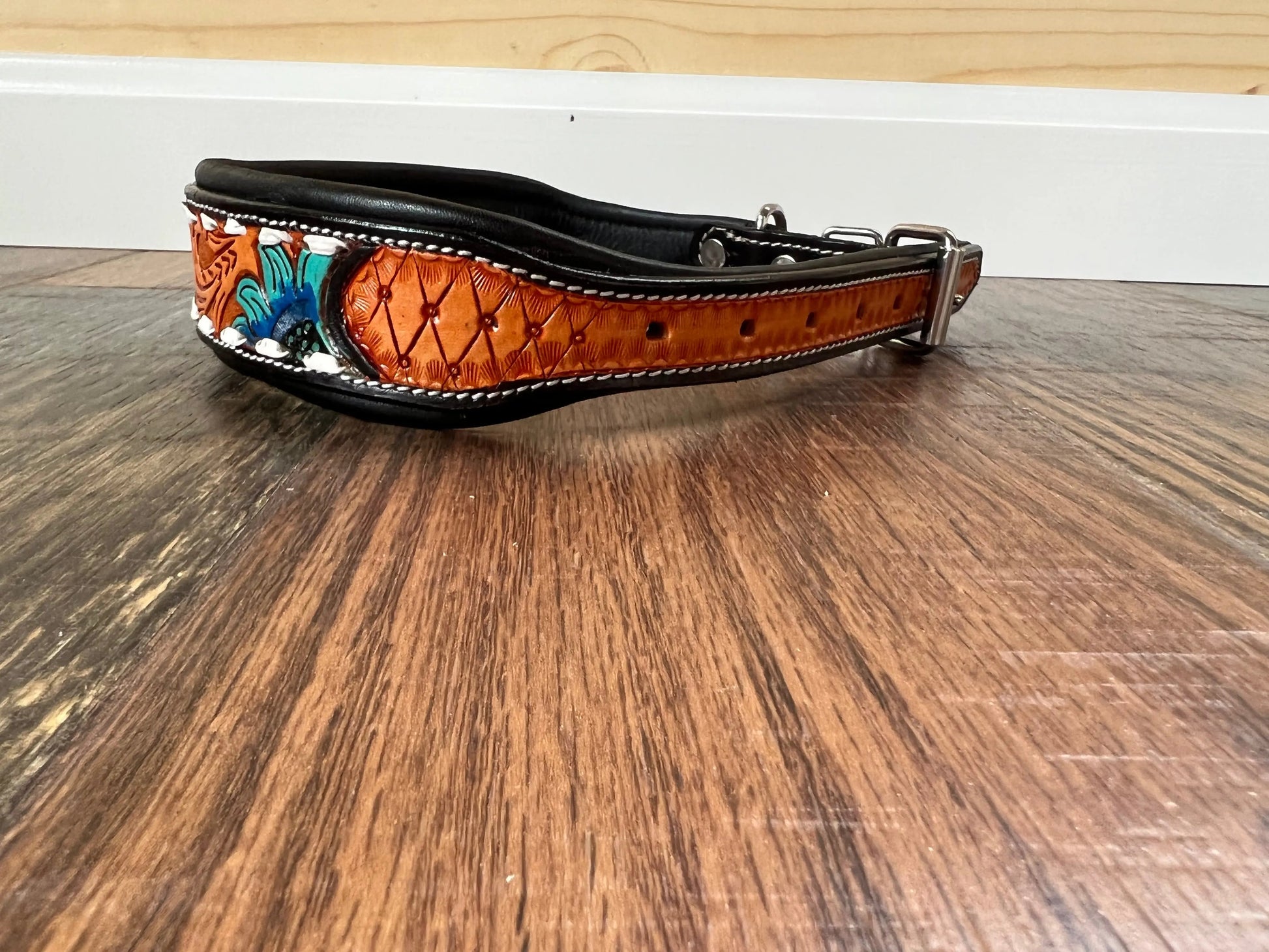 These Beautiful Handcrafted Dog Collars are made with Genuine leather. They are fully padded for comfort. The Collar is accented Beautiful Blue Sunflower Tooling & Handpainted .
