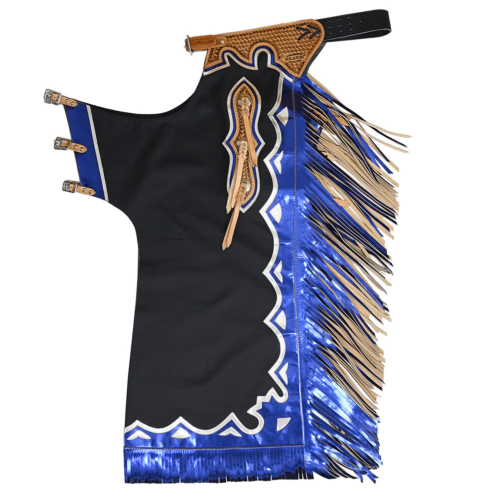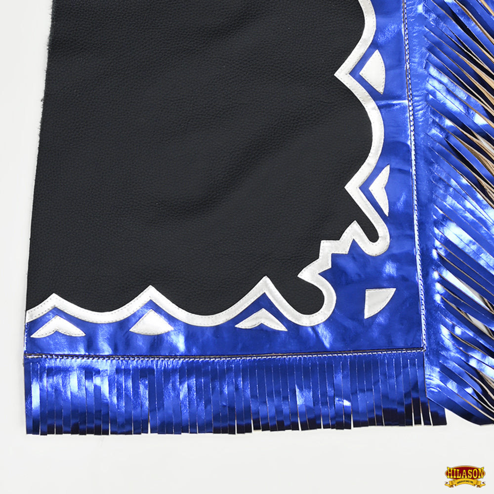 • FEATURES: Experience unmatched comfort and functionality with our Black colored Western chaps featuring Blue fringes and White trims. Size specifications: 38 In long with an adjustable (32 to 42 In) waist and (18 to 27 In) thigh. These riding chaps offer optimal flexibility and mobility, empowering you to move confidently and freely during every ride or outdoor activity.