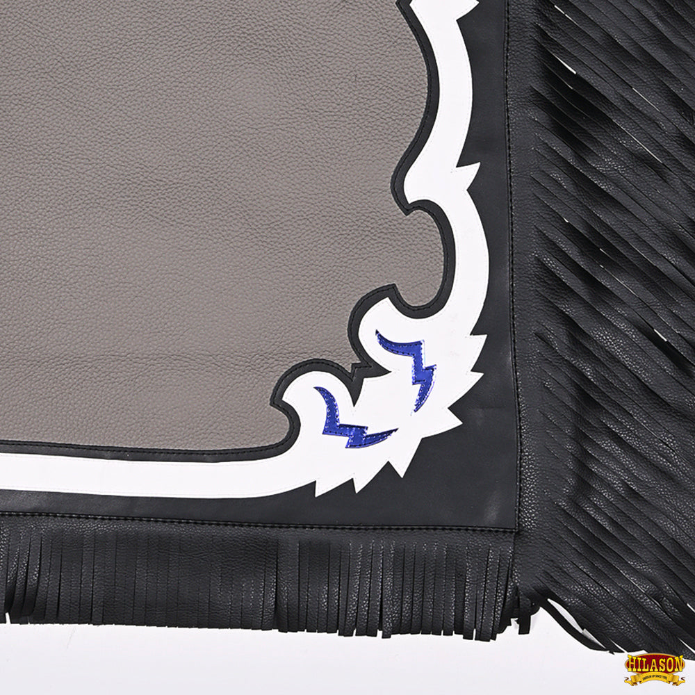 • FEATURES: Experience unmatched comfort and functionality with our Grey colored Western chaps featuring Black fringes and White trims. Size specifications: 38 In long with an adjustable (32 to 42 In) waist and (18 to 27 In) thigh. These riding chaps offer optimal flexibility and mobility, empowering you to move confidently and freely during every ride or outdoor activity.