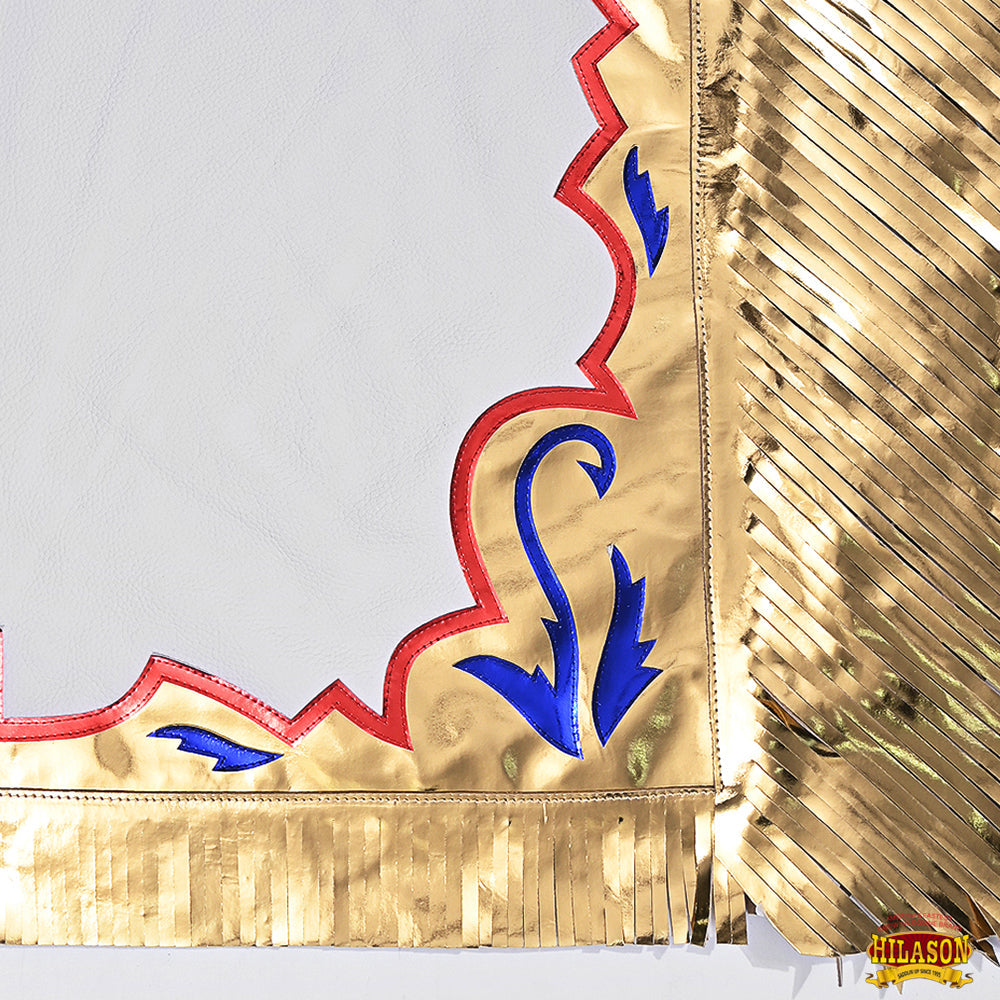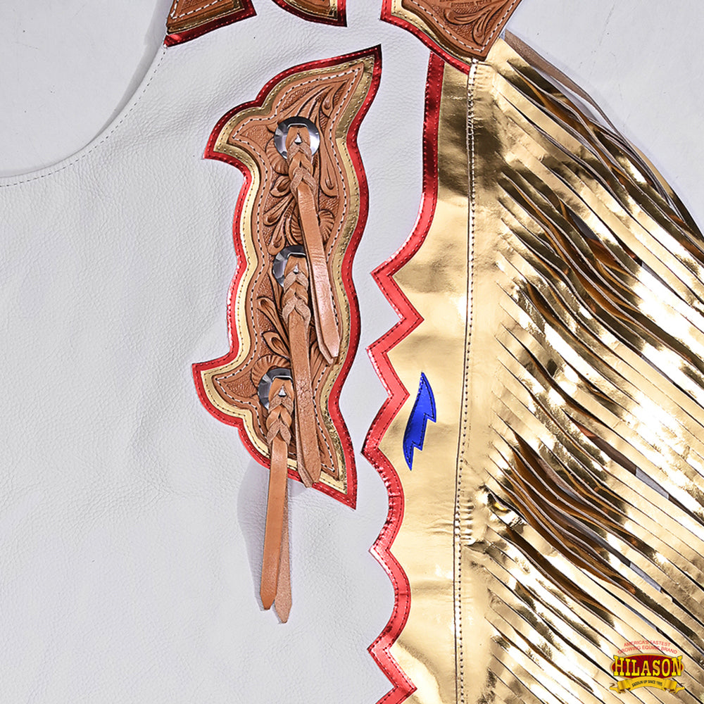• FEATURES: Experience unmatched comfort and functionality with our White colored Western chaps featuring Gold fringes and Brown trims. Size specifications: 38 In long with an adjustable (32 to 42 In) waist and (18 to 27 In) thigh. These riding chaps offer optimal flexibility and mobility, empowering you to move confidently and freely during every ride or outdoor activity.