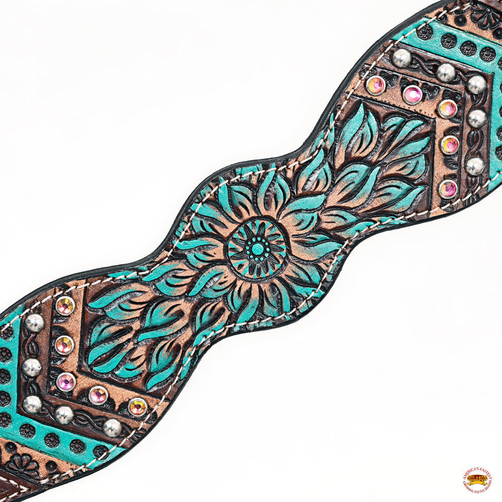 FEATURES: This horse's headstall & breast collar features a gorgeous Detailed Hand tooled, carved and painted design and Decorated with eye catching rivets in a hand finished dark brown color.