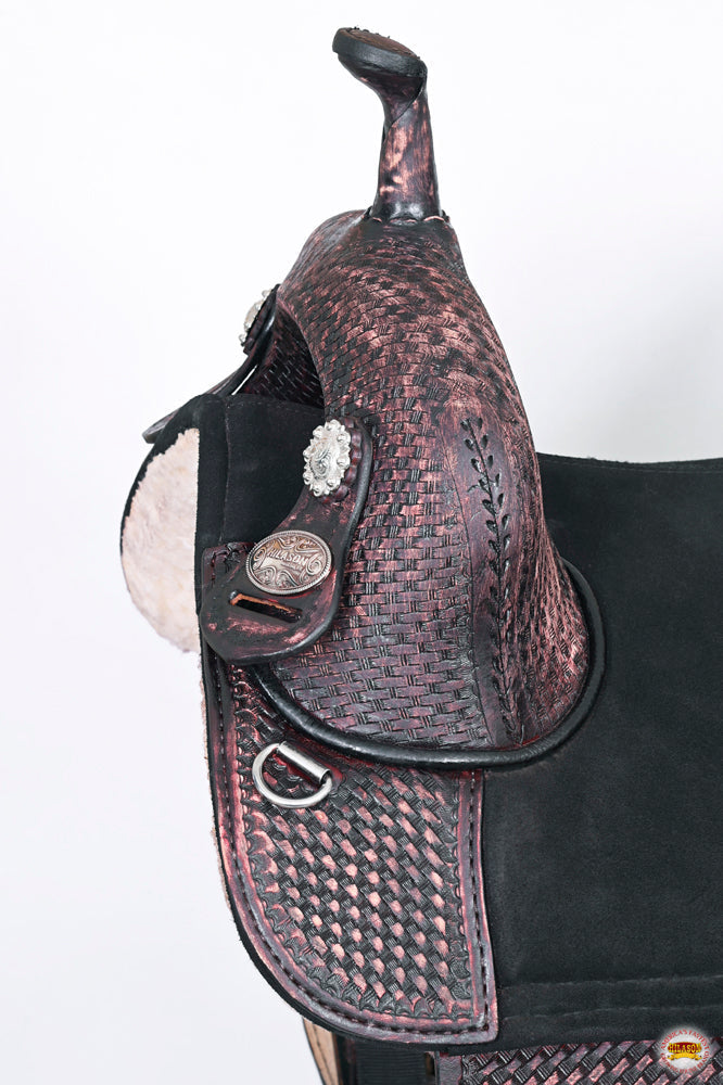 ✔ FEATURES : This horse's saddle features a gorgeous hand tooling basketweave design in a Hand finished Vintage Chocolate color. Fits 6 to 8 inches gullet size horses. Black Rough out seat, Deep 5-inch cantle.Anti-slip Stirrups Approx 25 Inch skirt length, weight, 21 LBS.