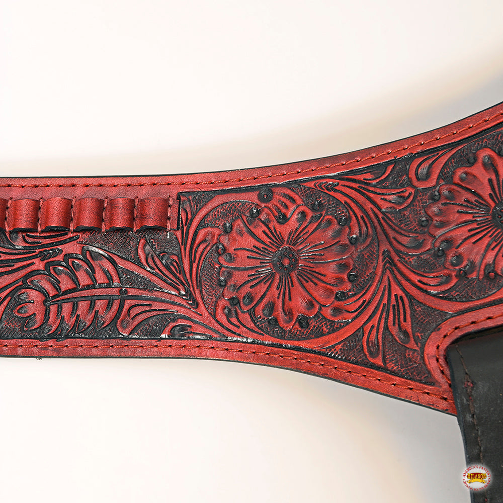 • ✔ EXQUISITE ARTISTRY: It is meticulously Hand tooled, and Hand carved with traditional designs. The leather gun holster showcases expert craftsmanship and includes practical features such as a metal core casing making it unbreakable and non-collapsible, an adjustable hammer loop, a leather leg tie, and a leg flap behind the holster, enhancing durability and comfort. A gun belt that holds about 16-52 rounds of ammo.