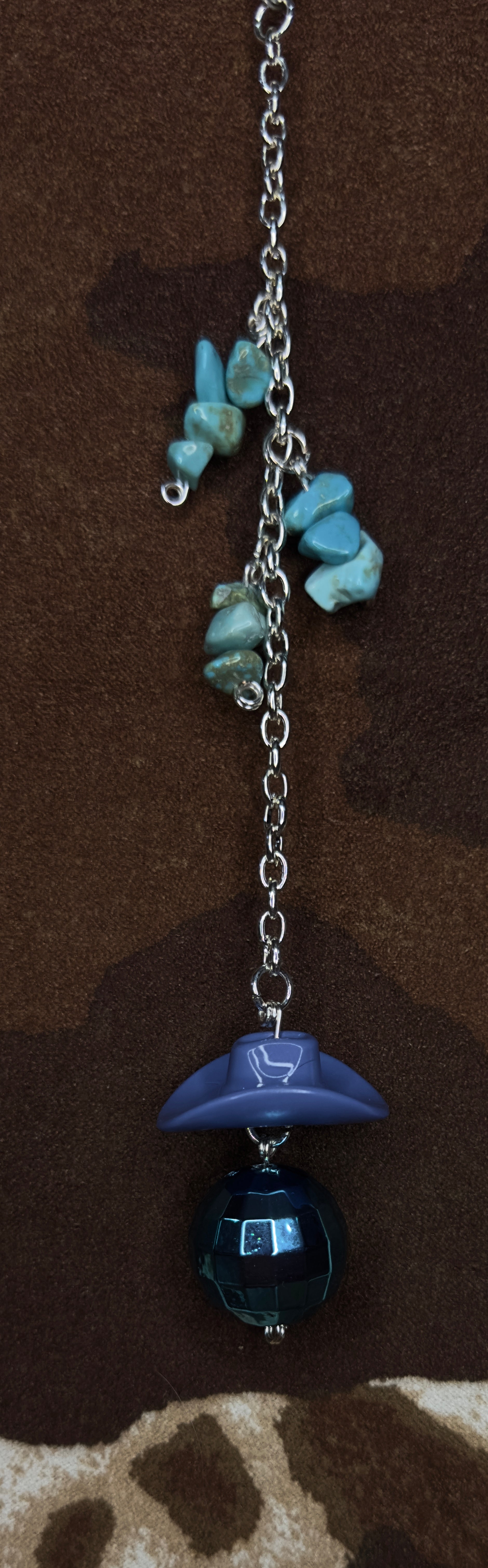 Hit the road in full western glam with the Honky Tonk Blues Mirror Charm. This handmade dangle features a silver chain dripping with turquoise chip accents, a mini blue cowboy hat, and a sparkling blue disco ball — all perfectly stacked for that bold cowgirl energy. It swings with every turn and catches the light just right, adding a pop of personality to any ride.