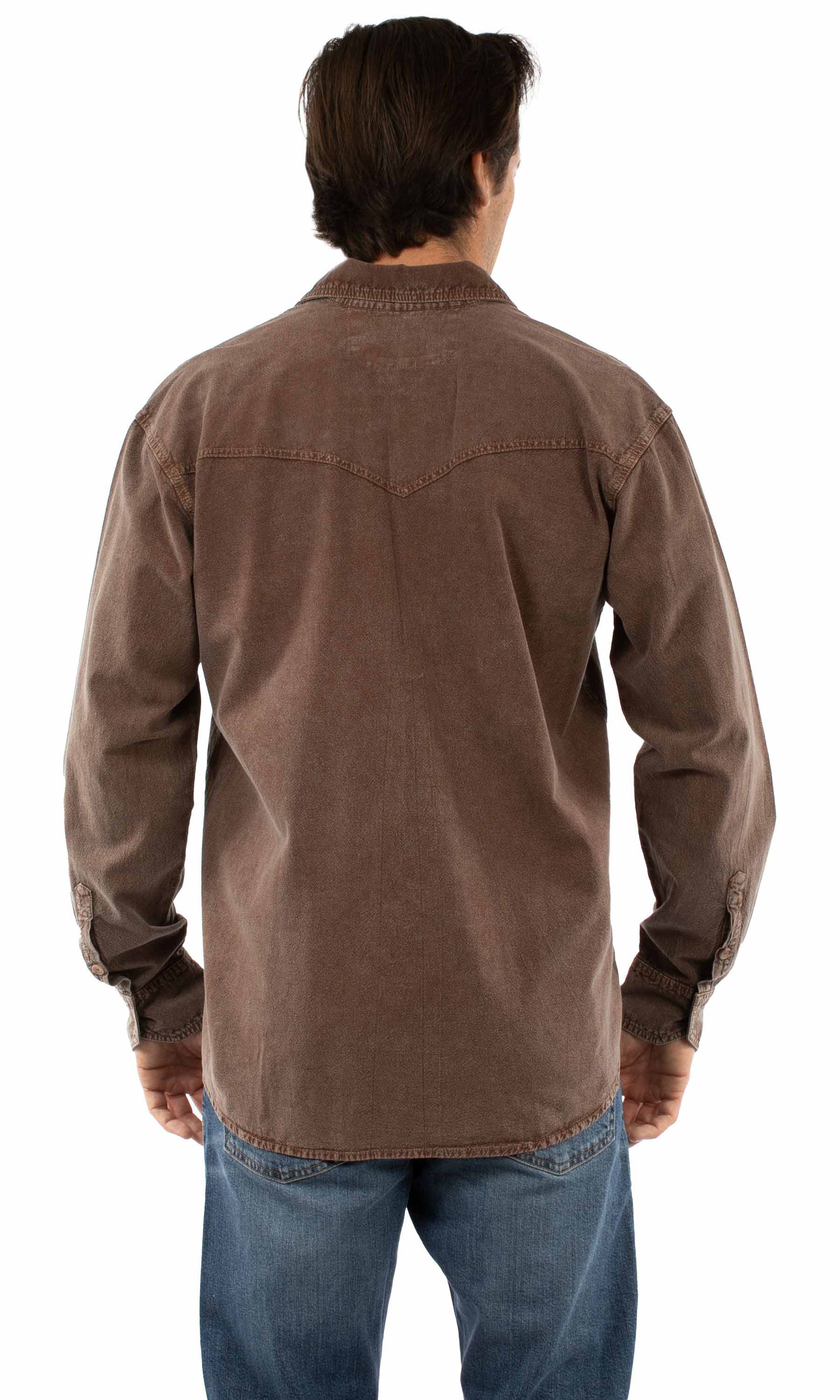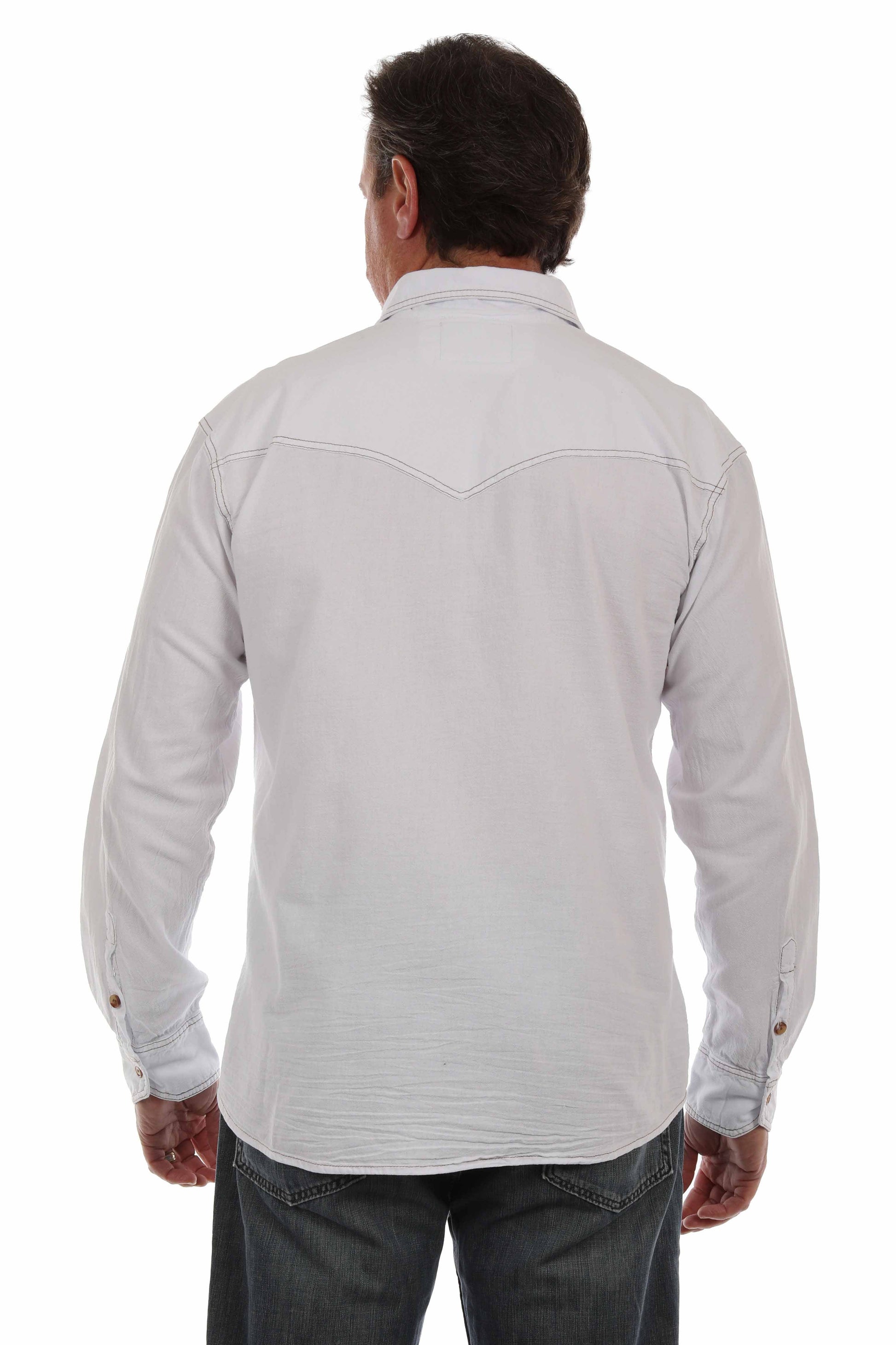 Long sleeve button front mens shirt with contrast stitching made in soft peruvian cotton. Features a full button front point collar with hidden button down and a softwestern back yoke. 100% cotton. Machine washable. Import.