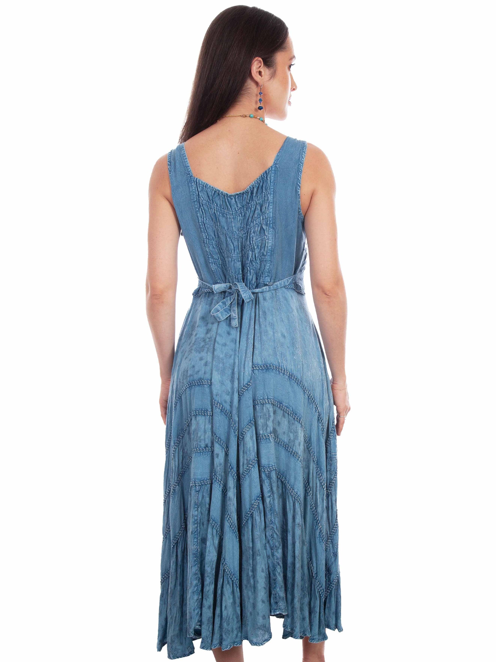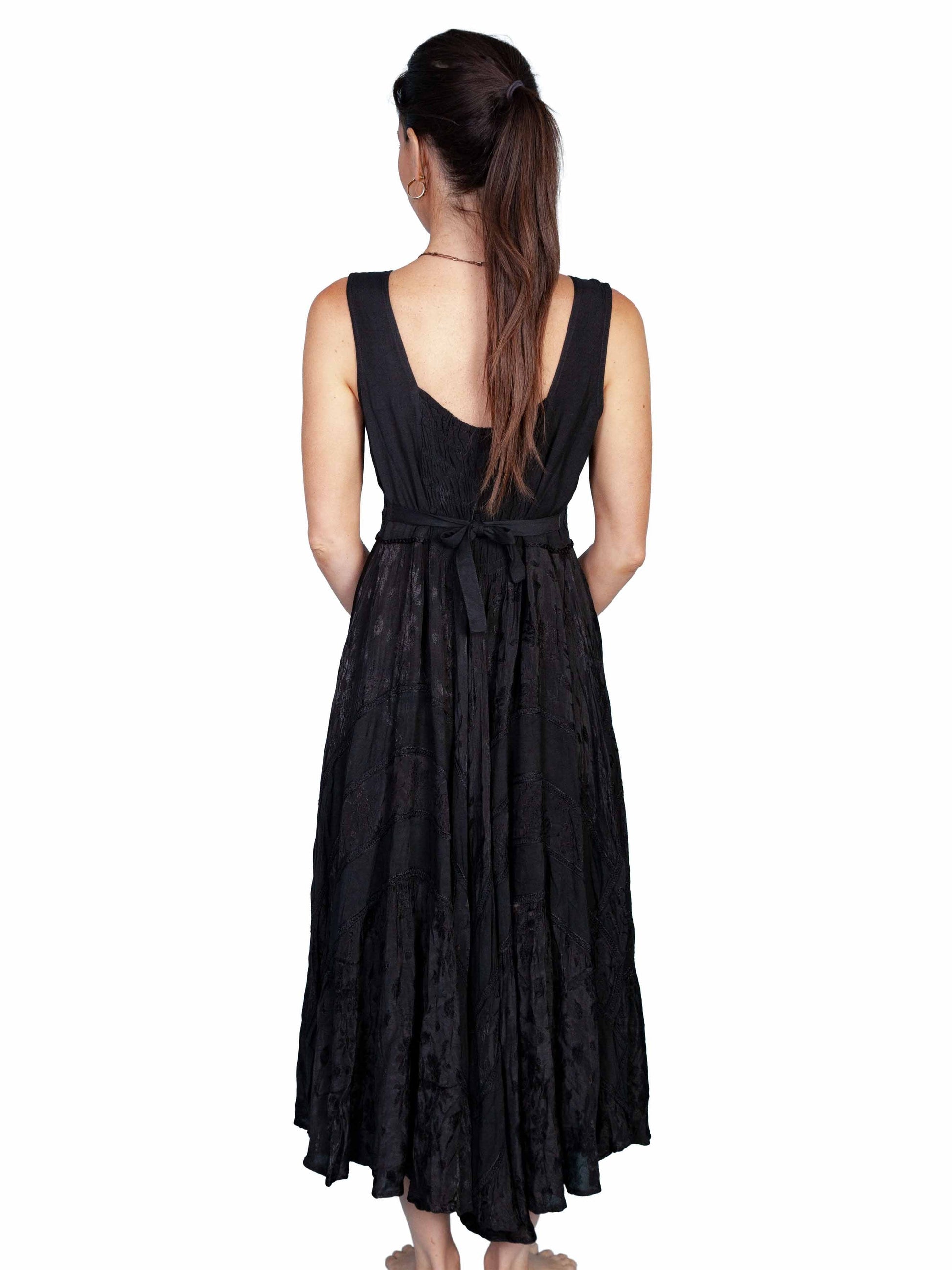 Full length lace-up front sleeveless dress. Scrolling fabric throughout. Tier panels in skirt area. 100% rayon. Hand wash cold and hang dry. Import.