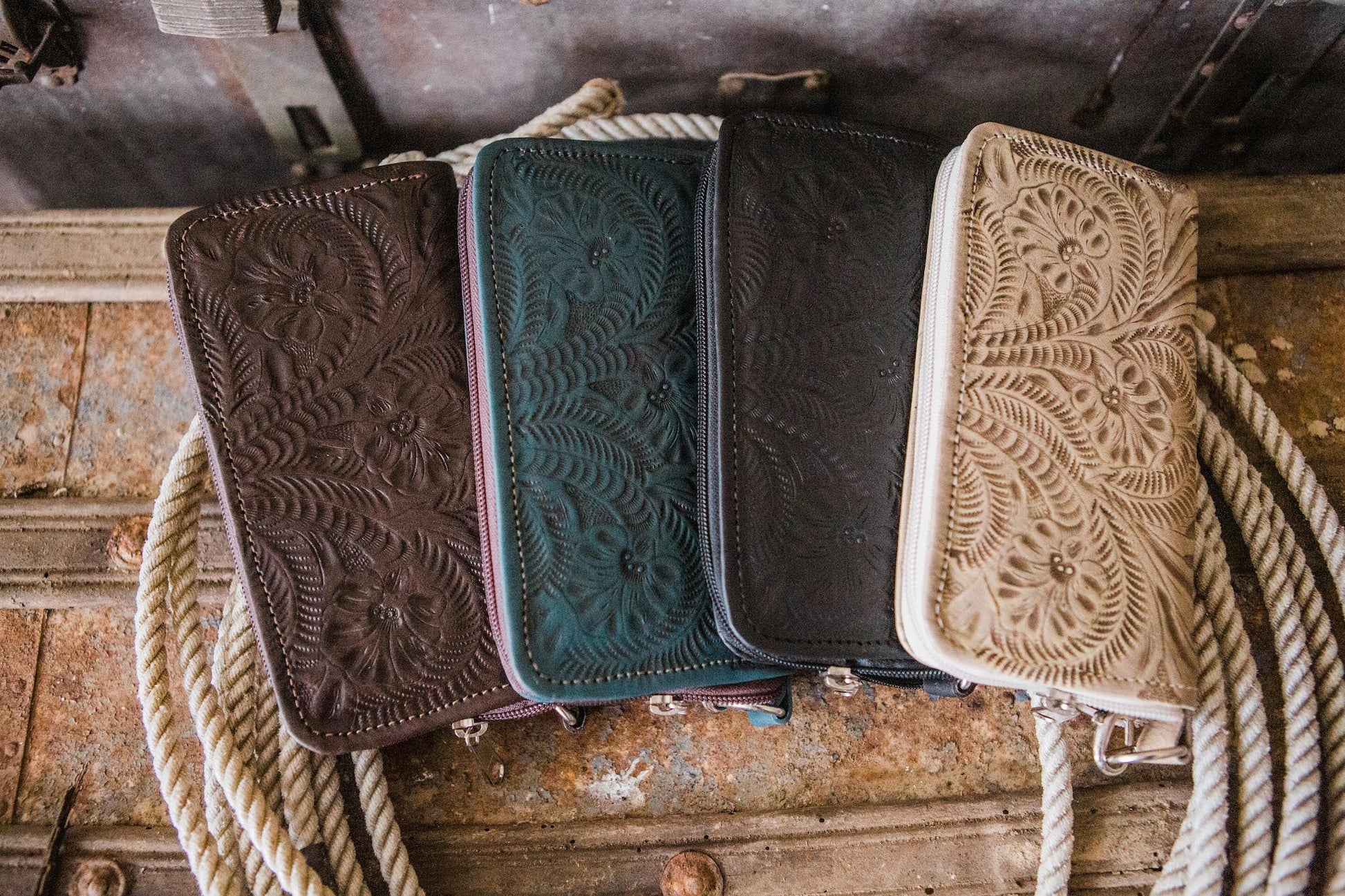Zip-around wallet. Made with 100% genuine leather inside and out. Accented with hand-tooled design on front and back. Inside has 12 card slots including 1 clear ID holder, 2 cash/slip pockets, 2 gusseted pockets, and a zippered coin pocket. Comes with removable leather wrist strap for extra convenience.