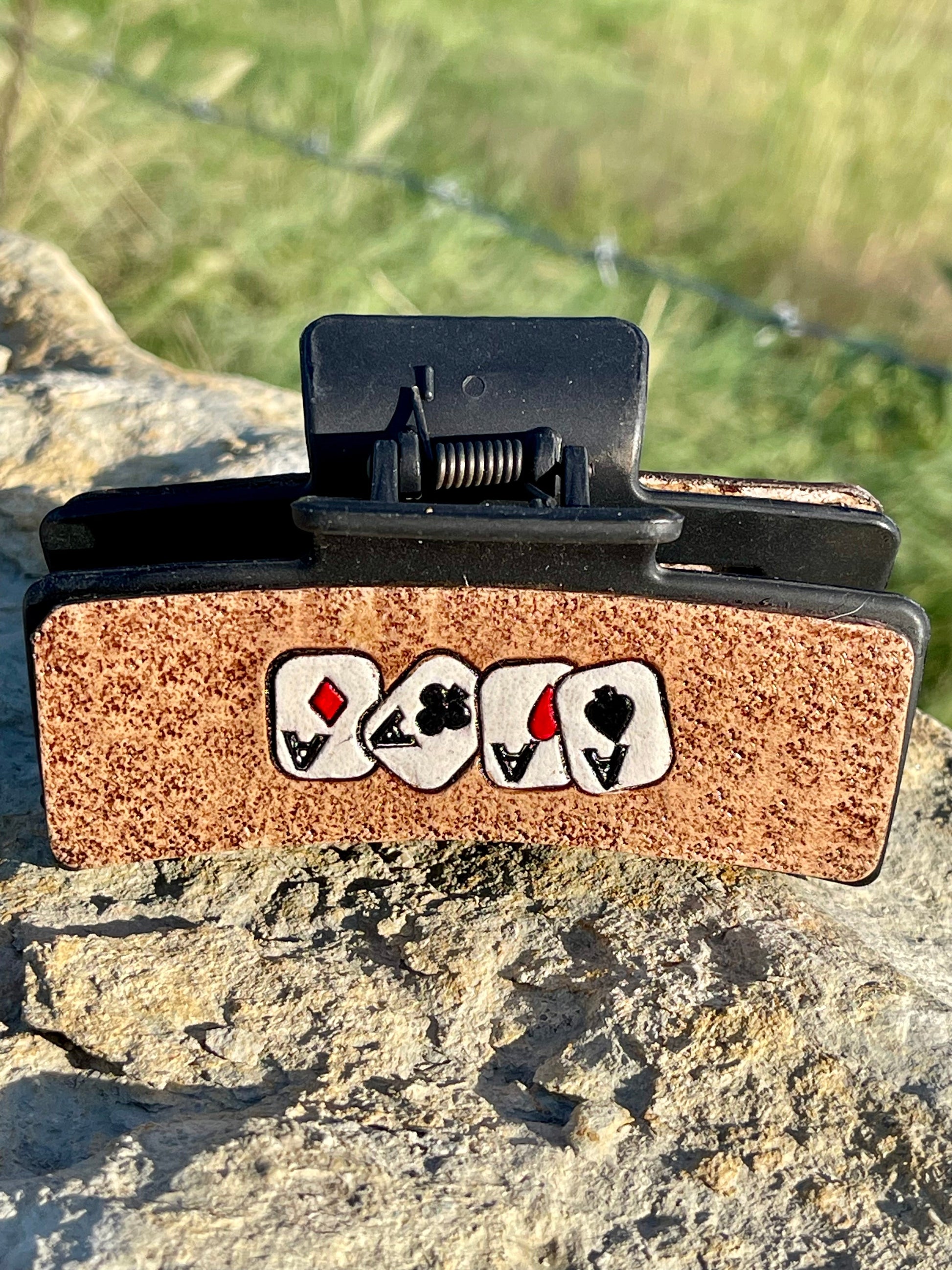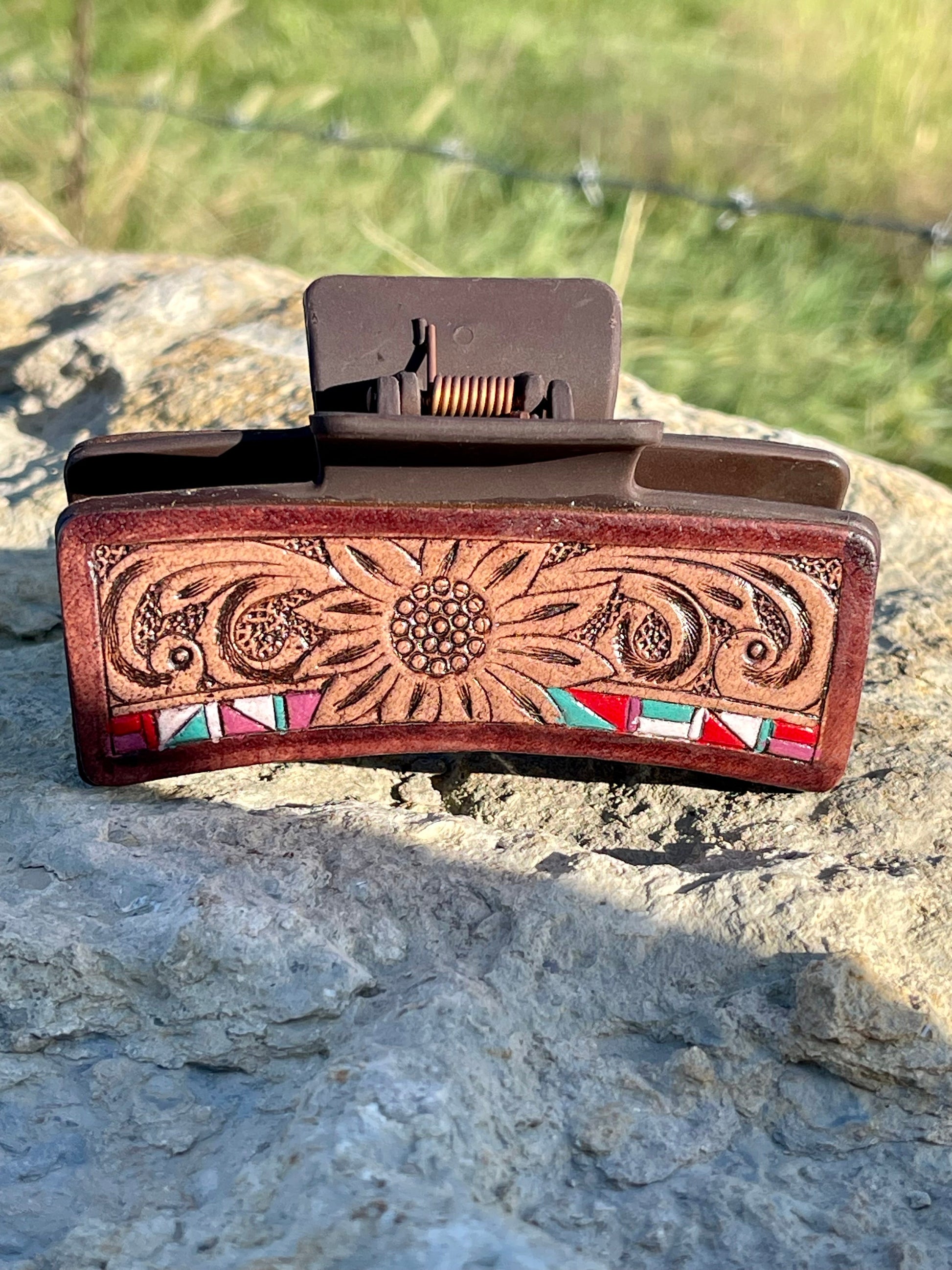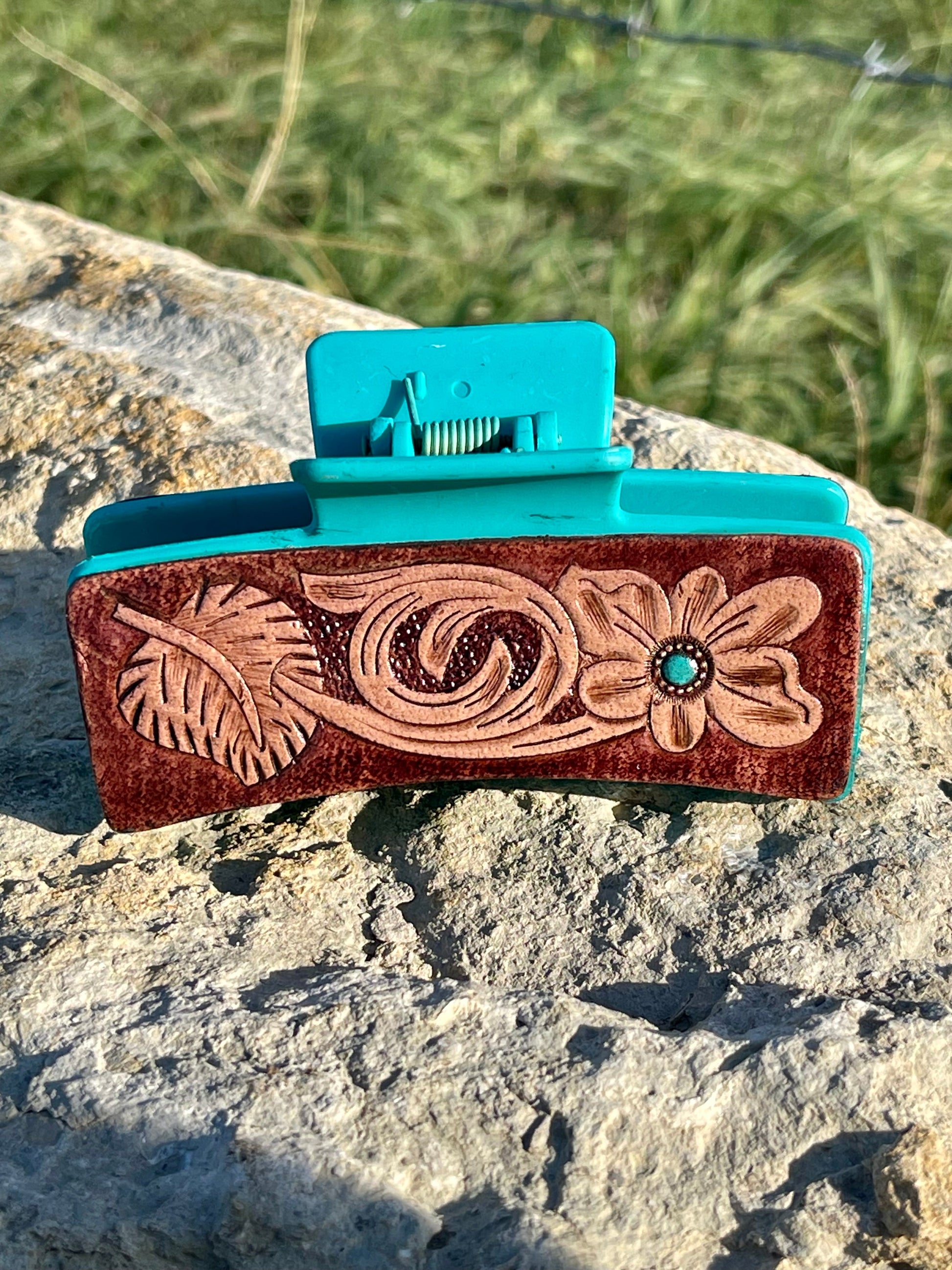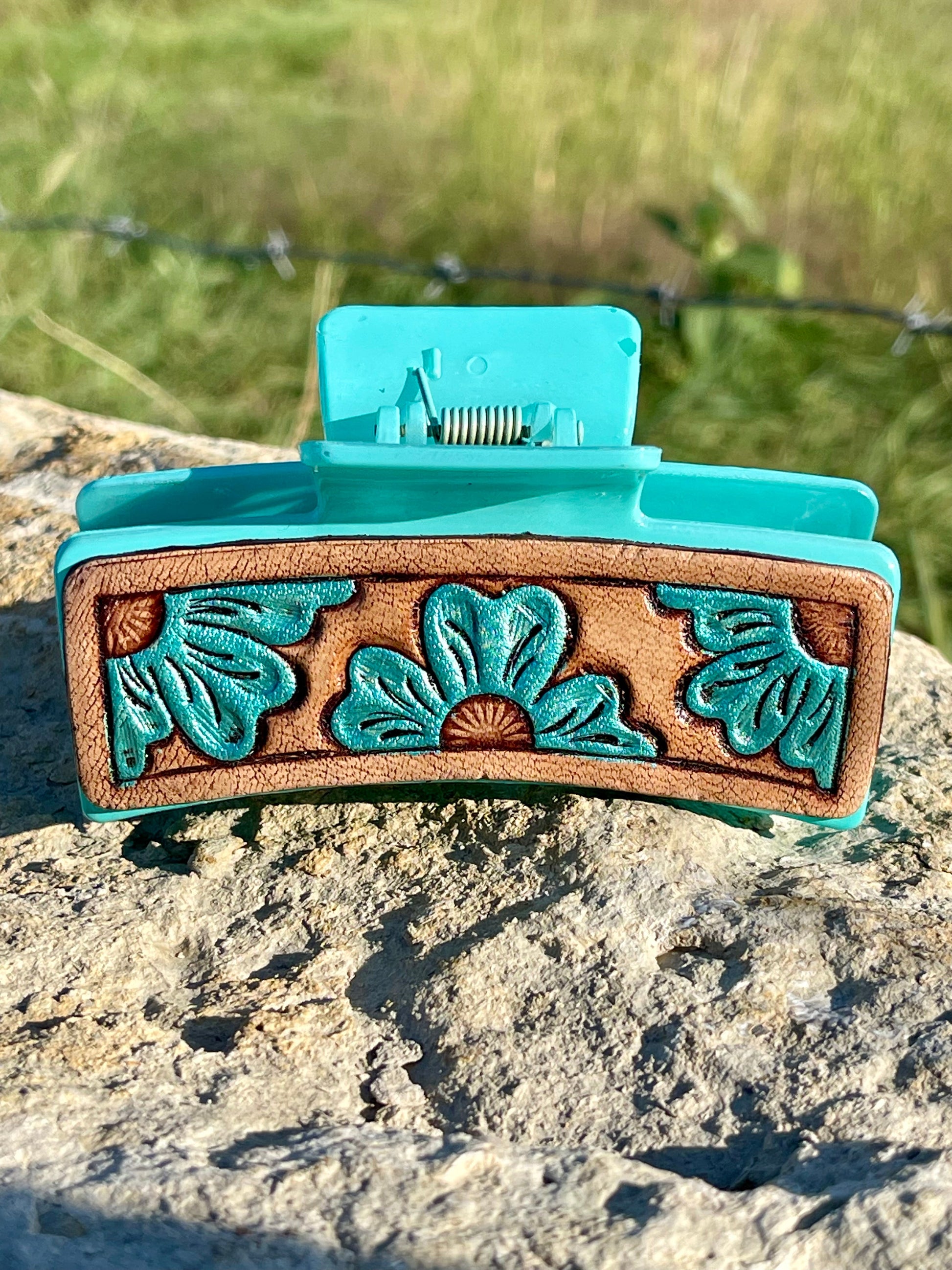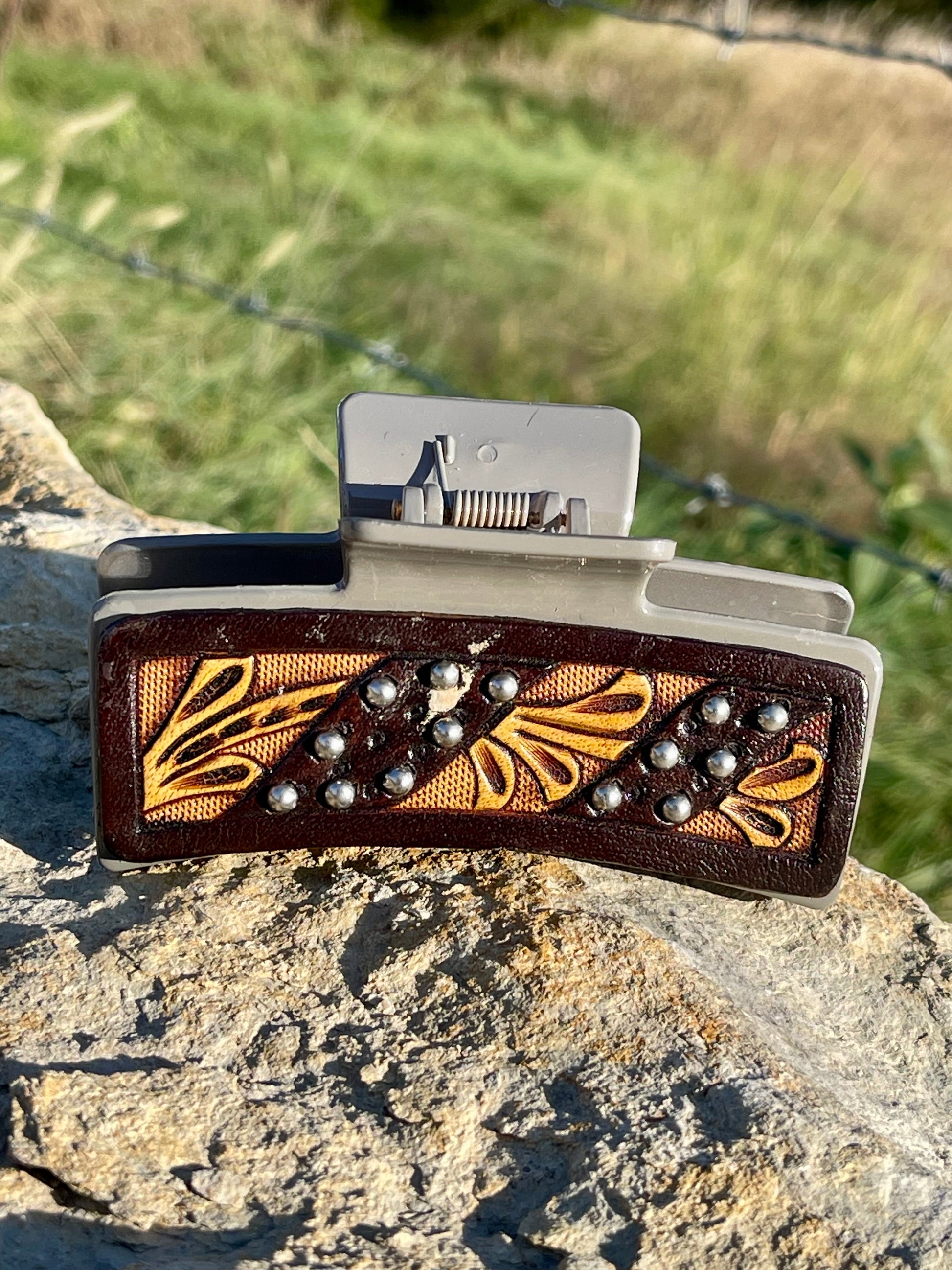 This 4-inch claw clip is made of high-quality, tooled leather, providing a durable and stylish solution for securing your hair.