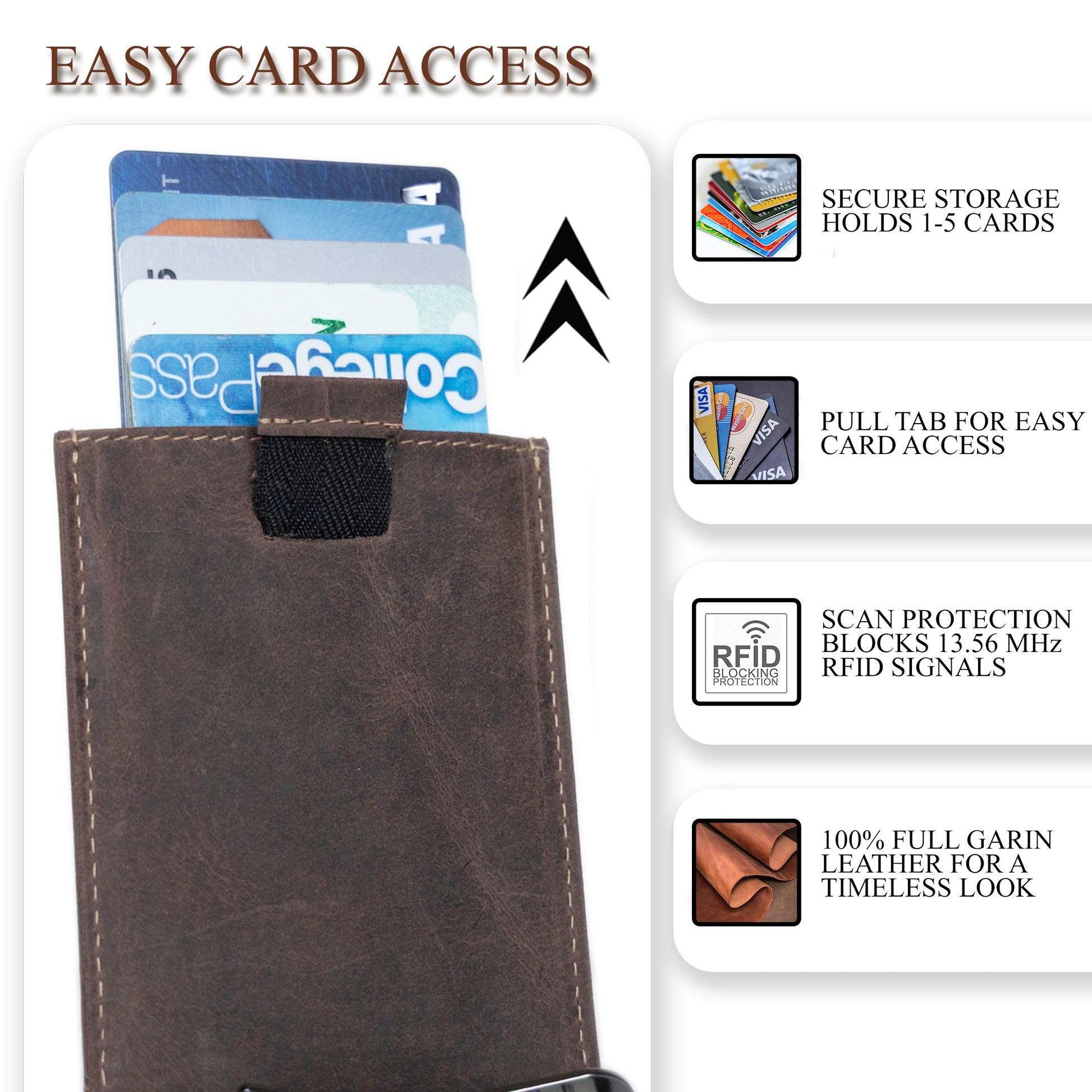 Compact & Functional: With a slim size of 4.25"x3", it holds up to 10 cards and bills without bulking up your pocket. It's got four card slots, an ID window, and a smart-pull feature for quick and easy access.