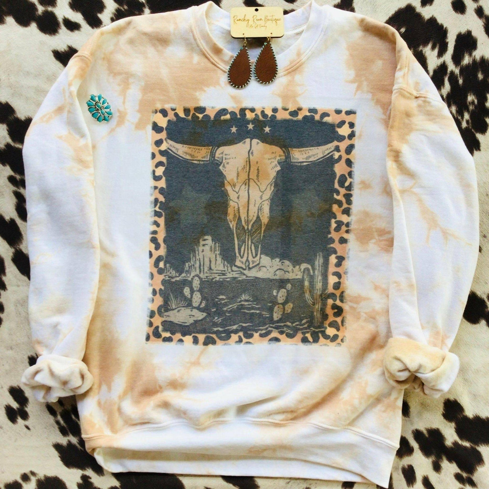 This hand dyed custom Leopard Bull Skull western sweatshirt can be dressed up or down