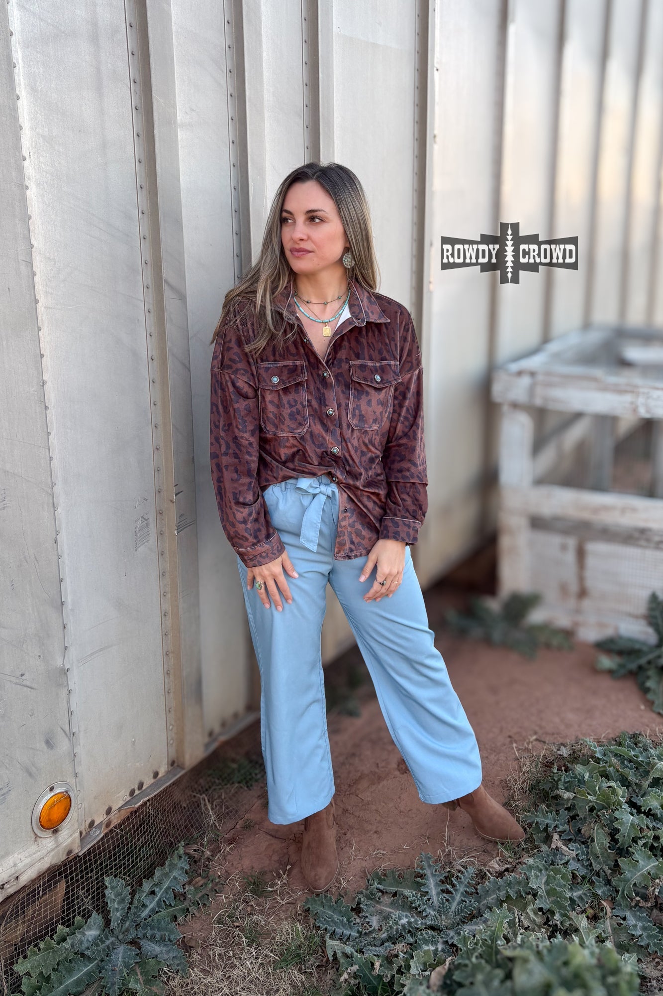Classic western with a wild twist- the Leopard Lady Button Up is a statement staple. Featuring an allover leopard print on a rich, earthy base, this button up is finished with concho buttons accented with turquoise for that perfect pop of western charm. Designed with chest pockets, contrast stitching, and a relaxed, easy fit, it’s made to wear buttoned up, layered, or thrown on over your favorite tee.