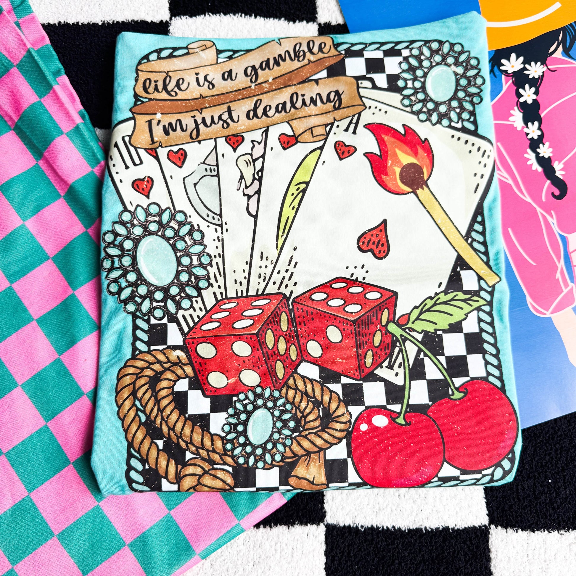 Roll the dice on style with our "Life is a Gamble" tee! Showcasing the sassy phrase "Life is a gamble, I'm just dealing" alongside playful cards, cherries, dice, and rope designs. This fun graphic shirt is your ace in the hole for making a statement—perfect for risk-takers and free spirits who play by their own rules!