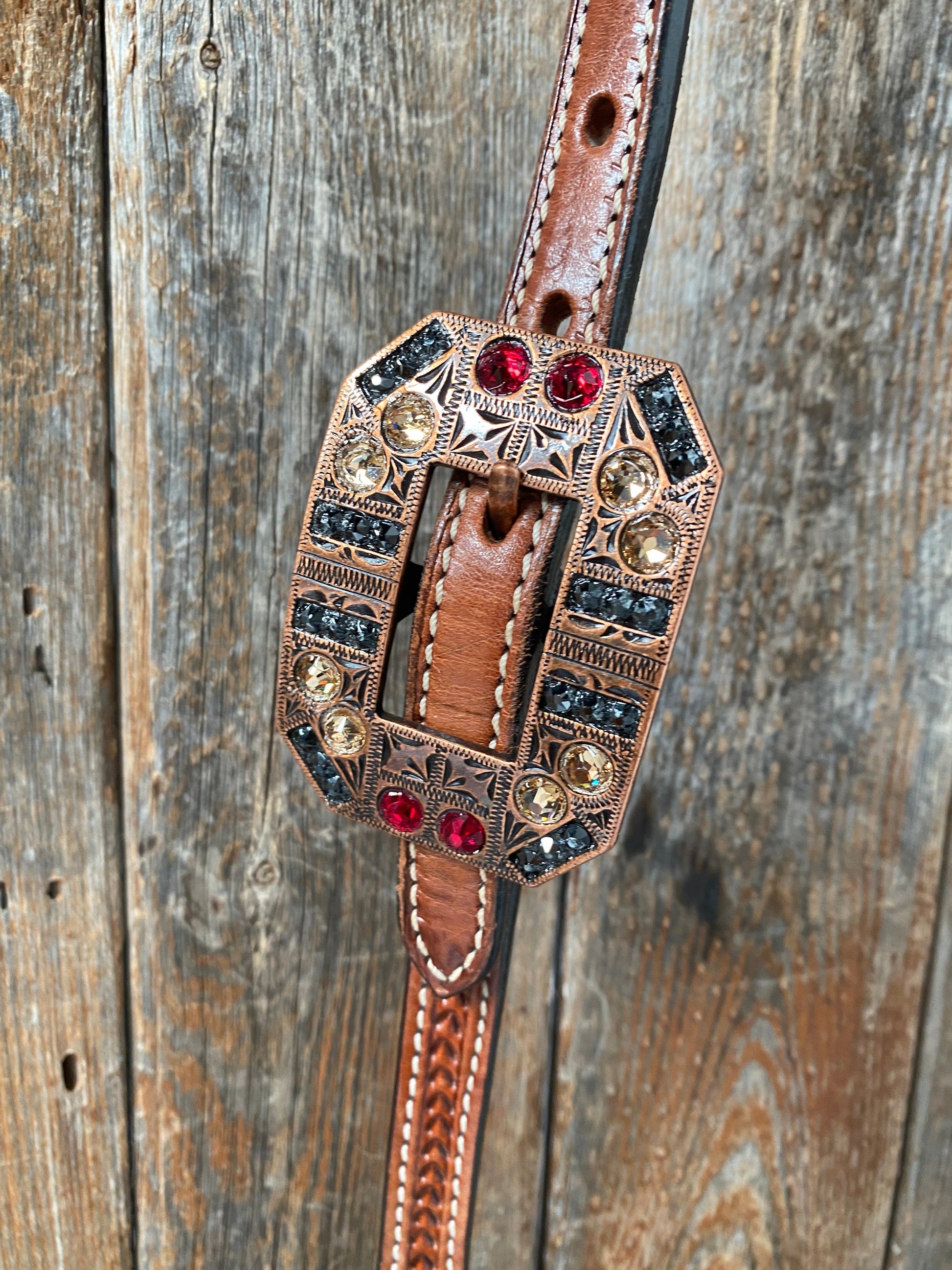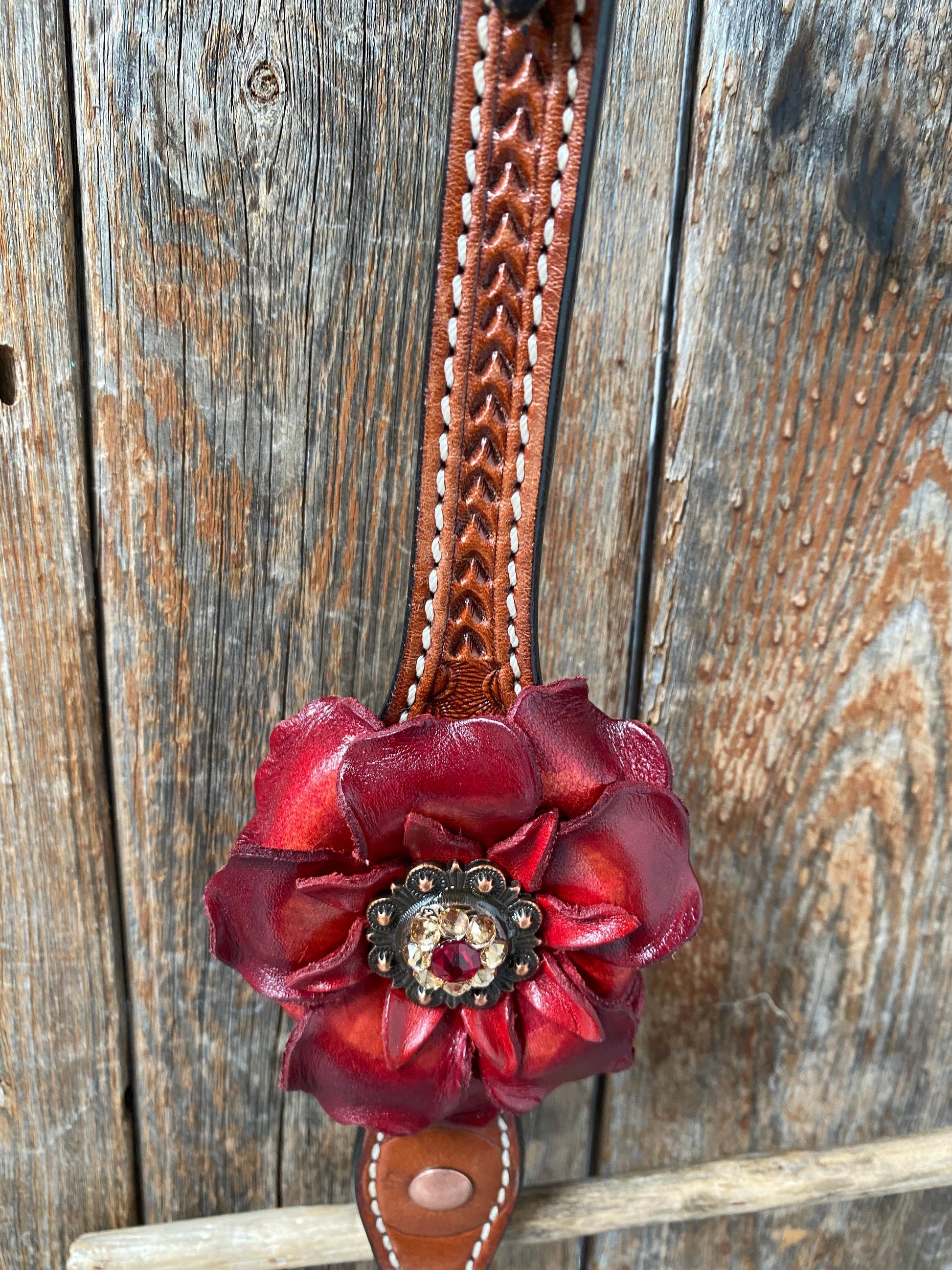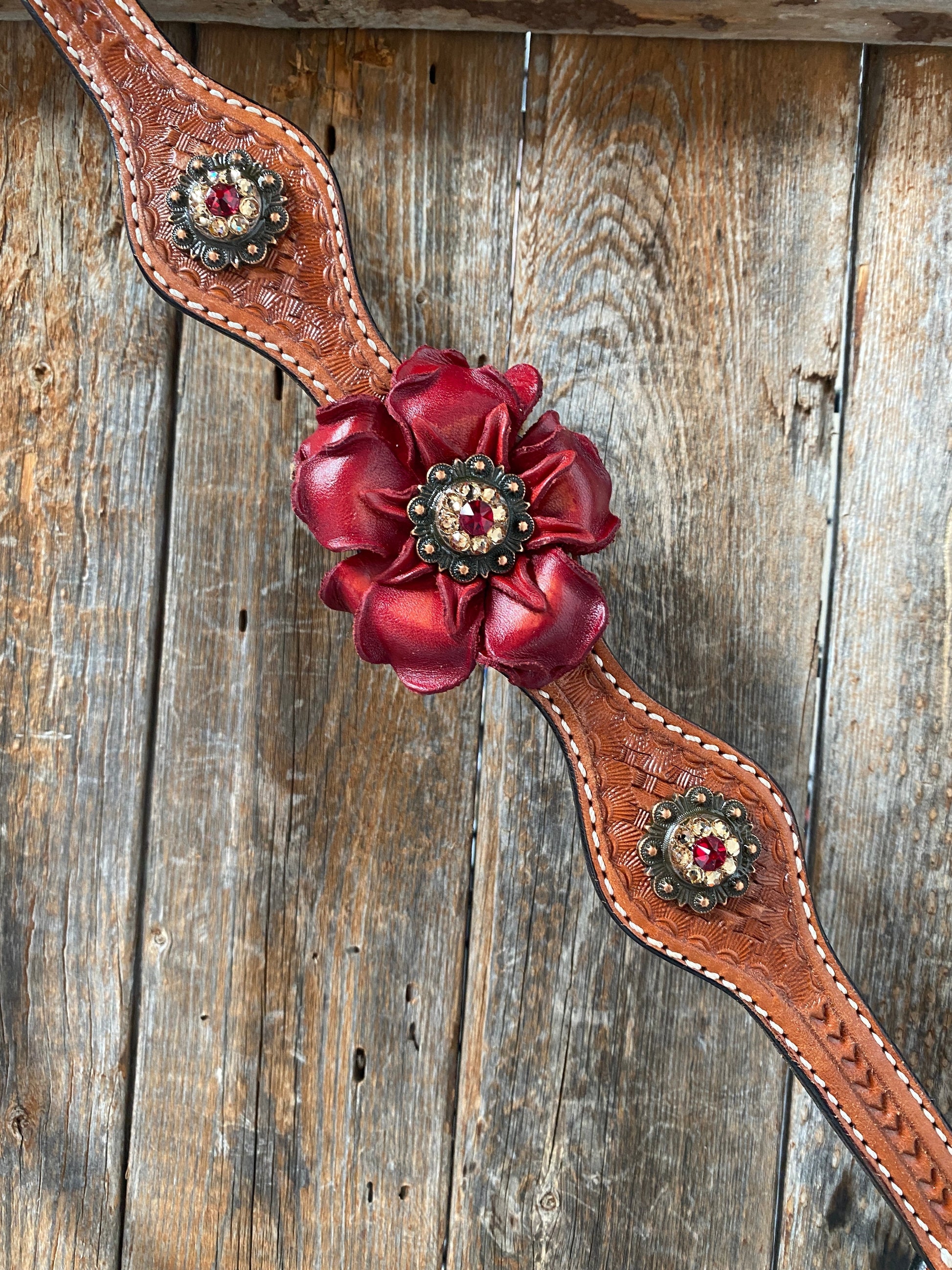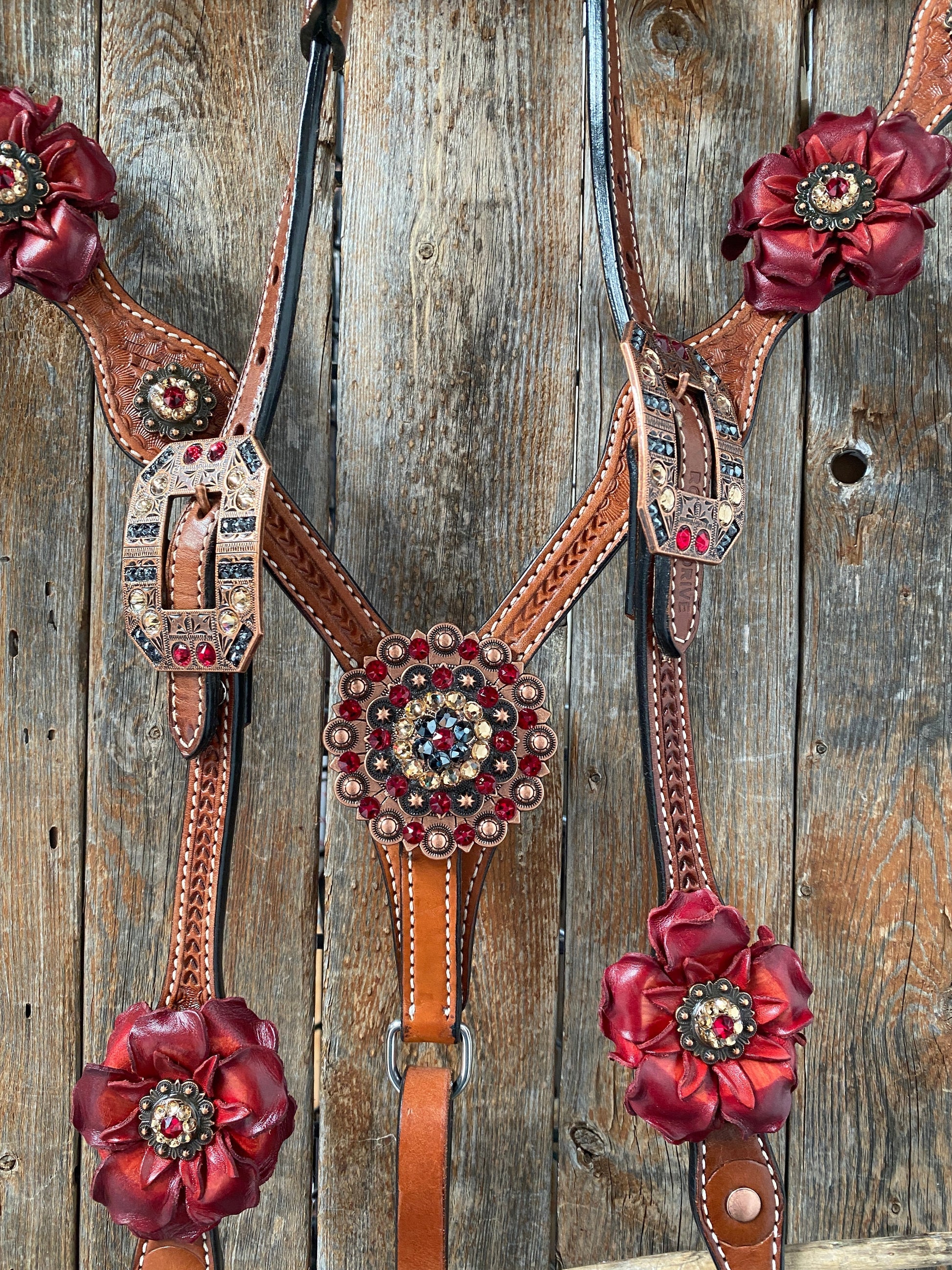 One ear and breastcollar are light oil basketweave style. Decorated with red gardenia flowers and ruby/jet/champagne copper conchos and buckles. Center of breastcollar accented with ruby copper berry jacket.