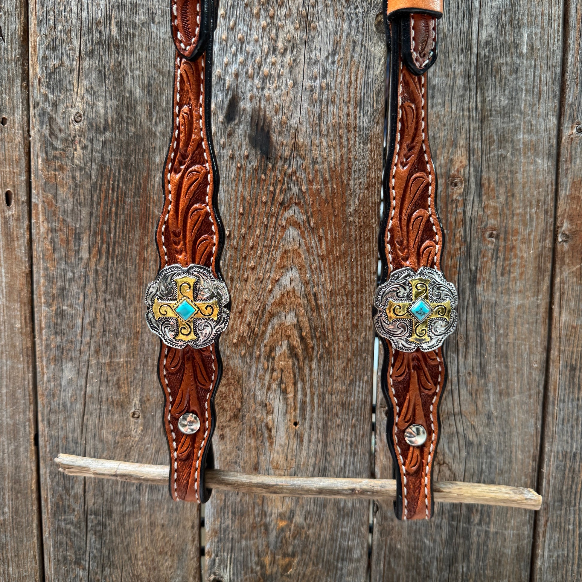 Browband, one Ear and breastcollar is light oil floral scalloped style. They are decorated with antique silver with gold cross and turquoise colored stone western conchos (W189).