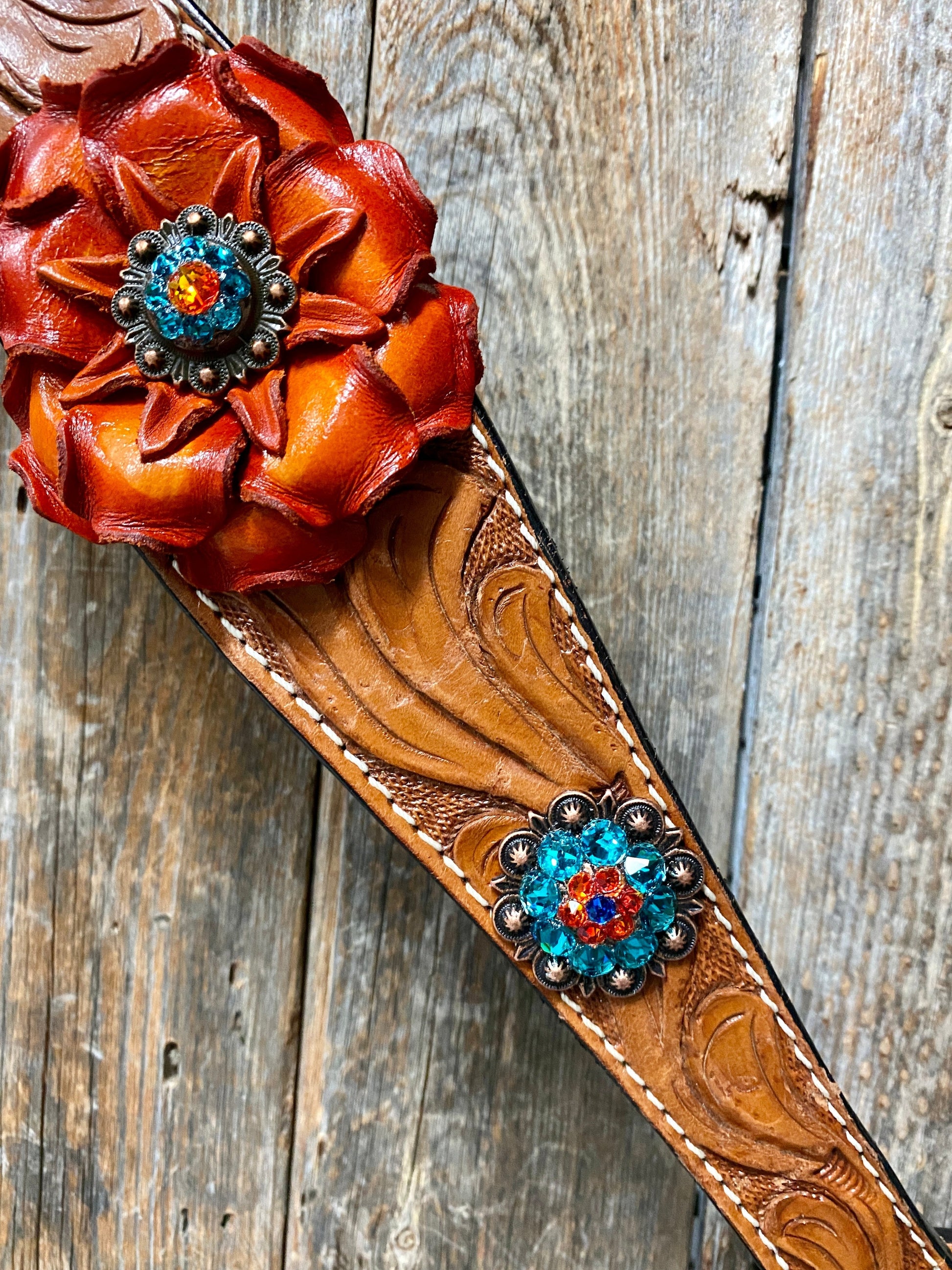 Browband and breastcollar is light oiled floral tooled design. They are decorated with orange gardenia flowers and copper Capri/fire opal/teal conchos.