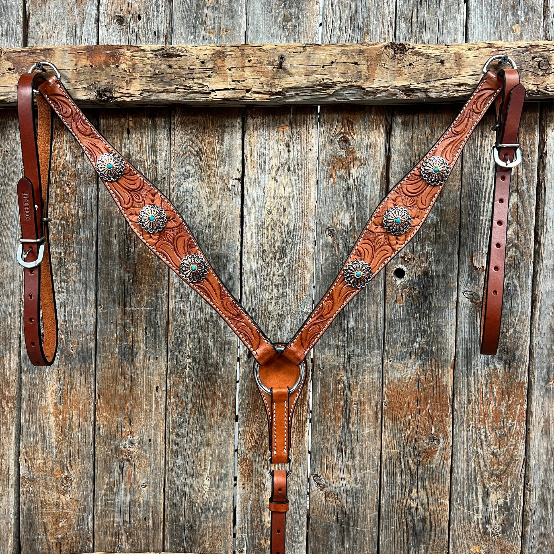 Browband and breastcollar is light oil floral tooled and V-Brow style. They are decorated with copper flower with turquoise colored center stone western conchos (W220) and copper engraved buckles (W156B).
