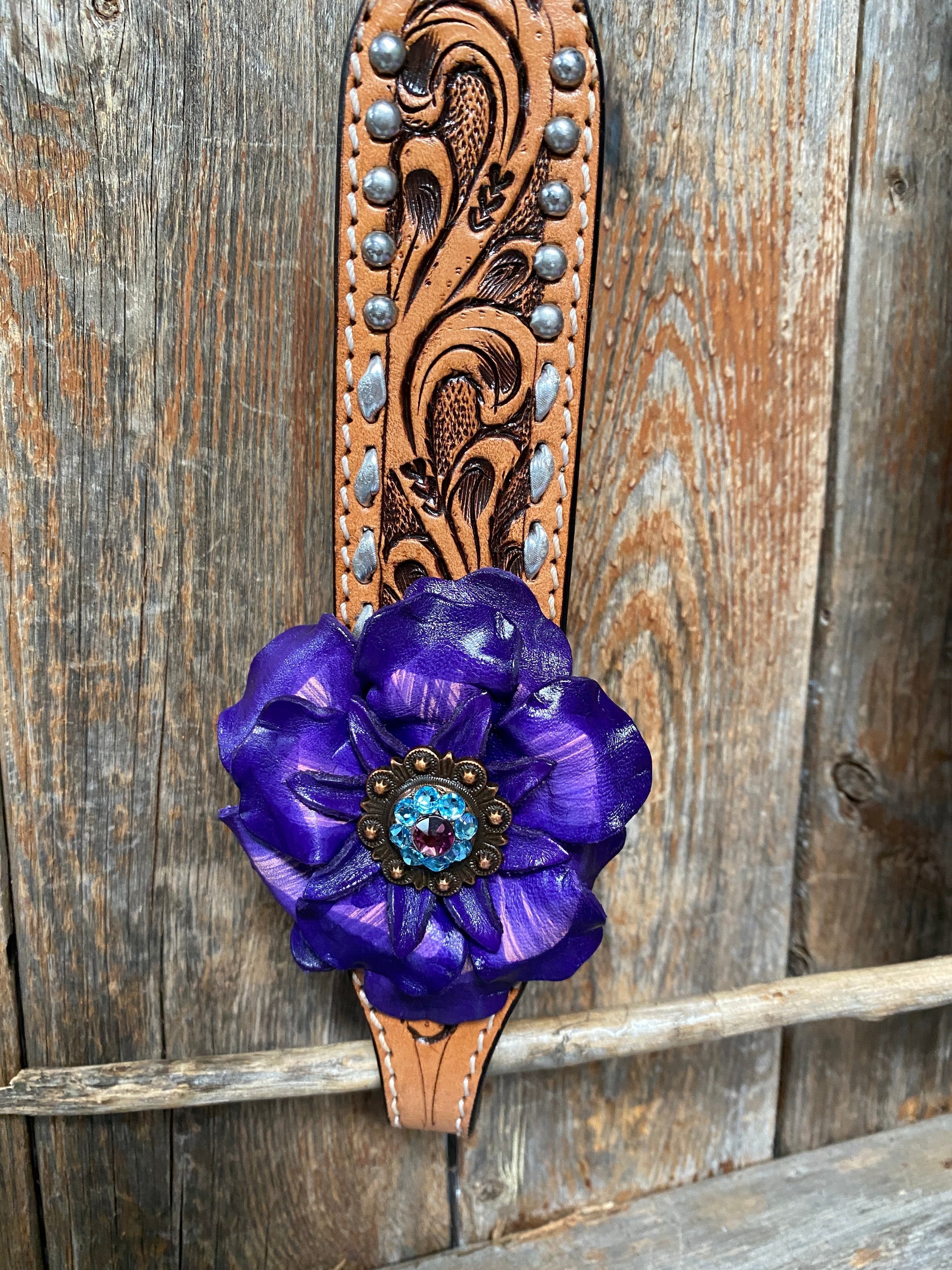 One ear and breastcollar is light oil silver dot and buckstitch style. They are decorated with purple gardenias and amethyst/aqua/clear copper conchos and buckles. Center of the breastcollar is accented with a clear copper berry jacket.