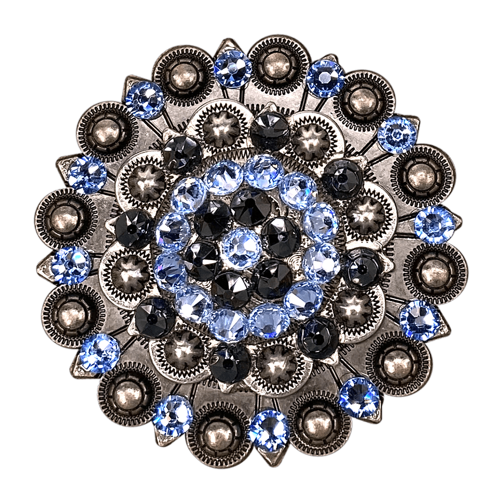 Antique Silver berry style concho decorated with Light Sapphire/Jet European crystals. This concho and berry jacket measures 3".