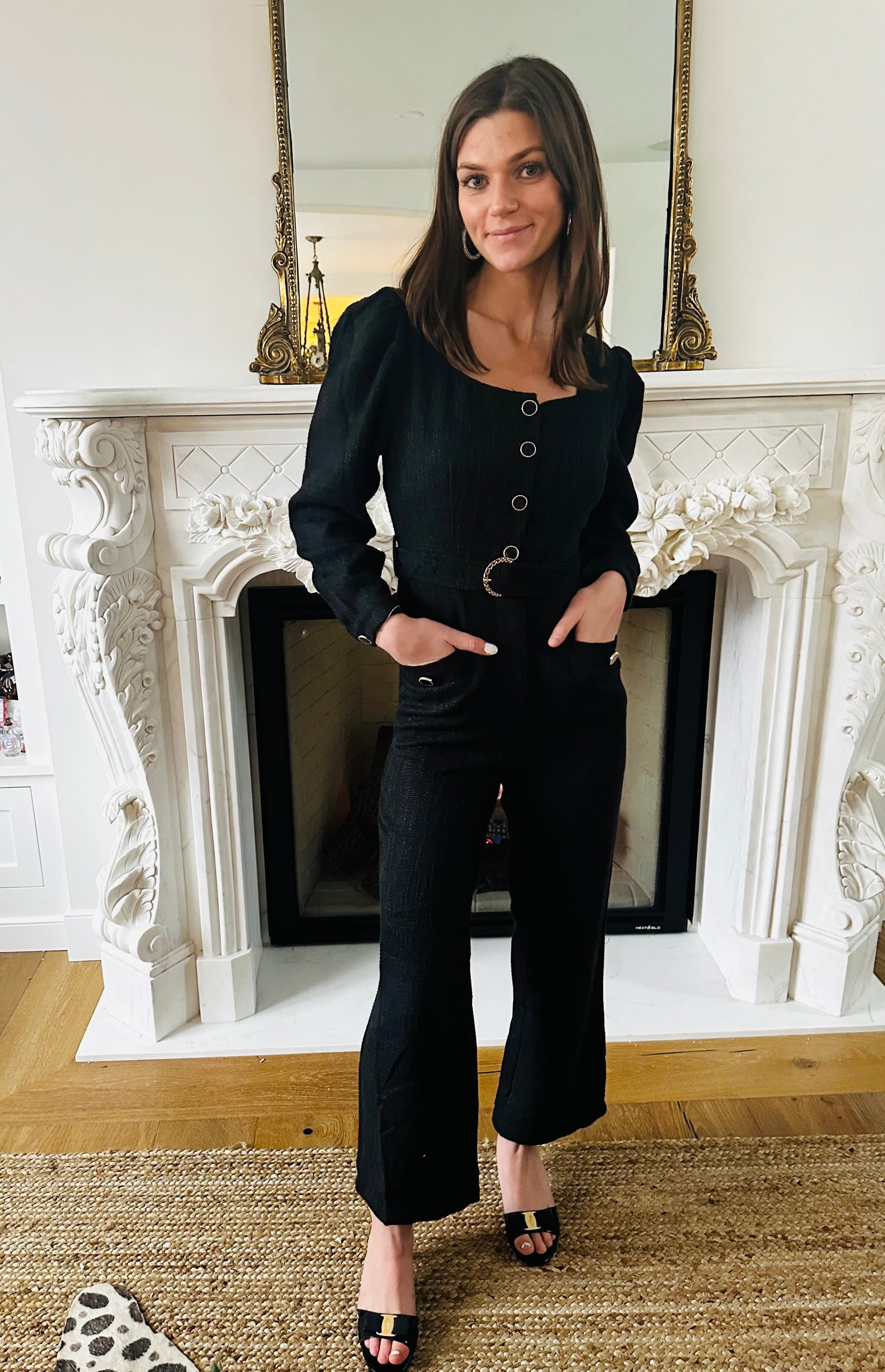 Long belted jumpsuit with a scoop neck and gold buttons.
