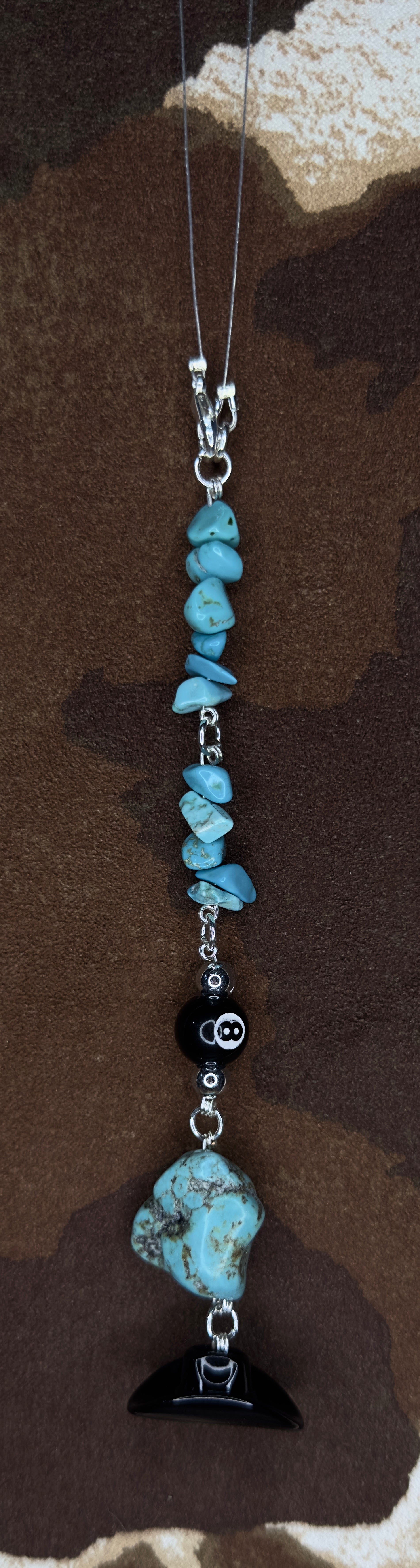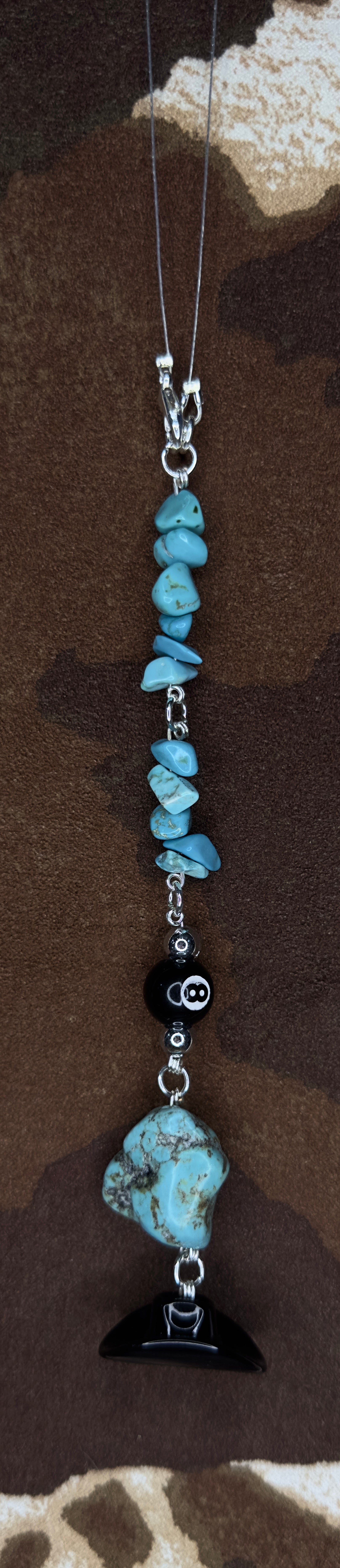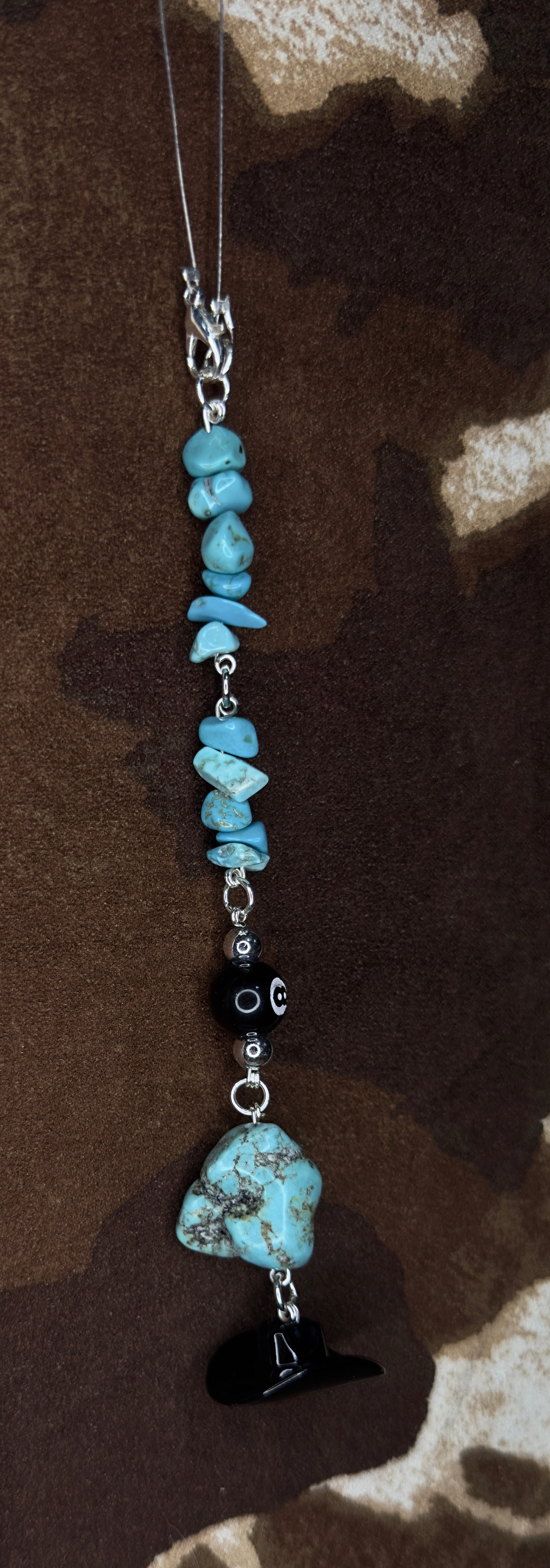 Add a bold twist to your ride with the Lucky Shot Mirror Charm. This handmade rearview charm features a silver chain strung with faux turquoise chip beads, a striking real turquoise stone centerpiece, a classic 8-ball charm, and a miniature black cowgirl hat. It’s western grit with a rebellious edge — made to hang, shine, and swing with every turn.