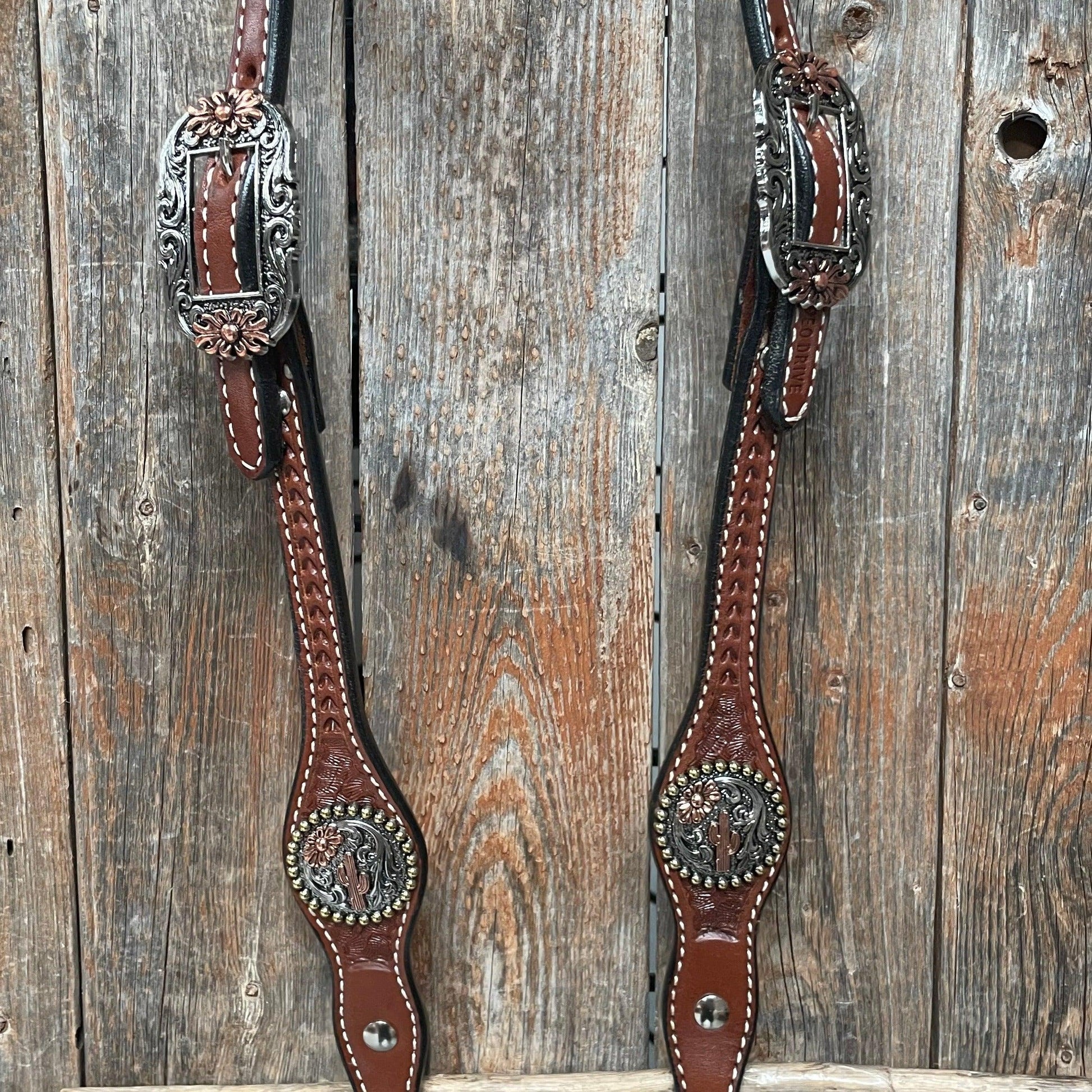 Medium Oil Basketweave Flower and Cactus Browband/One Ear Tack Set #BBBC491