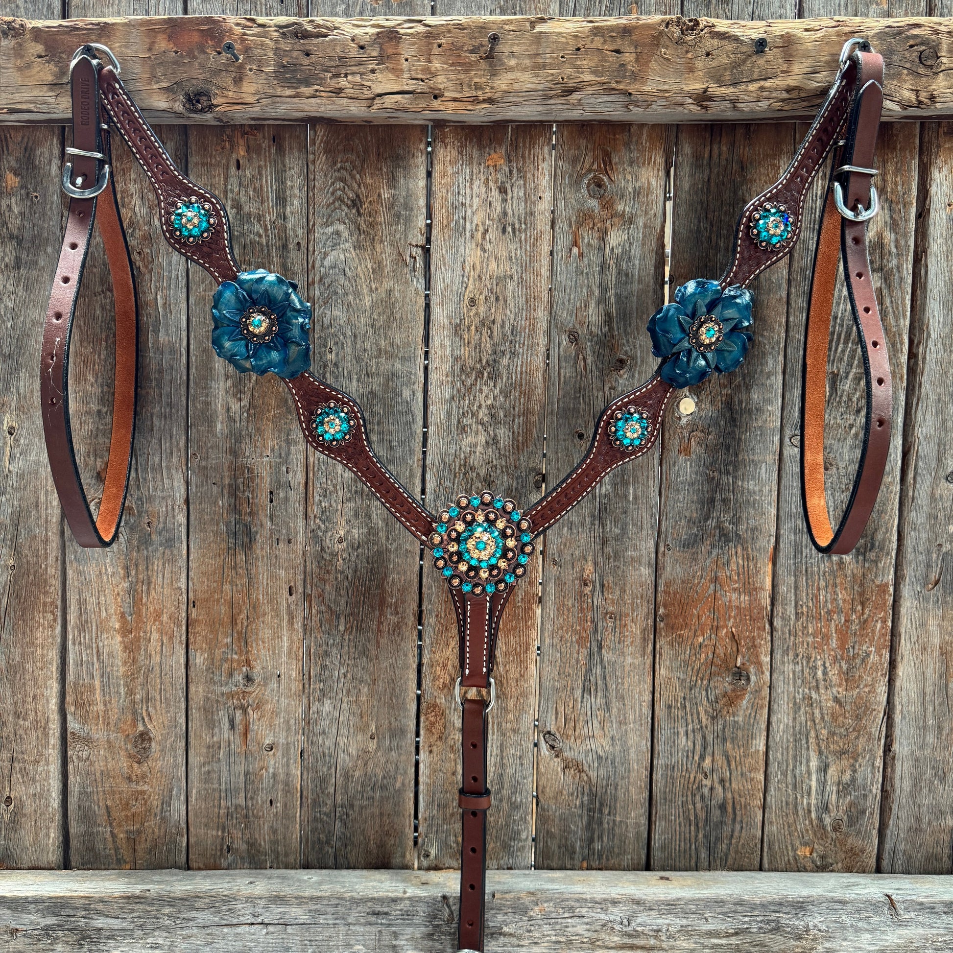 Browband, one ear and breastcollar is medium oil basketweave style. They are decorated with copper Teal/Champagne crystal conchos and turquoise gardenias.