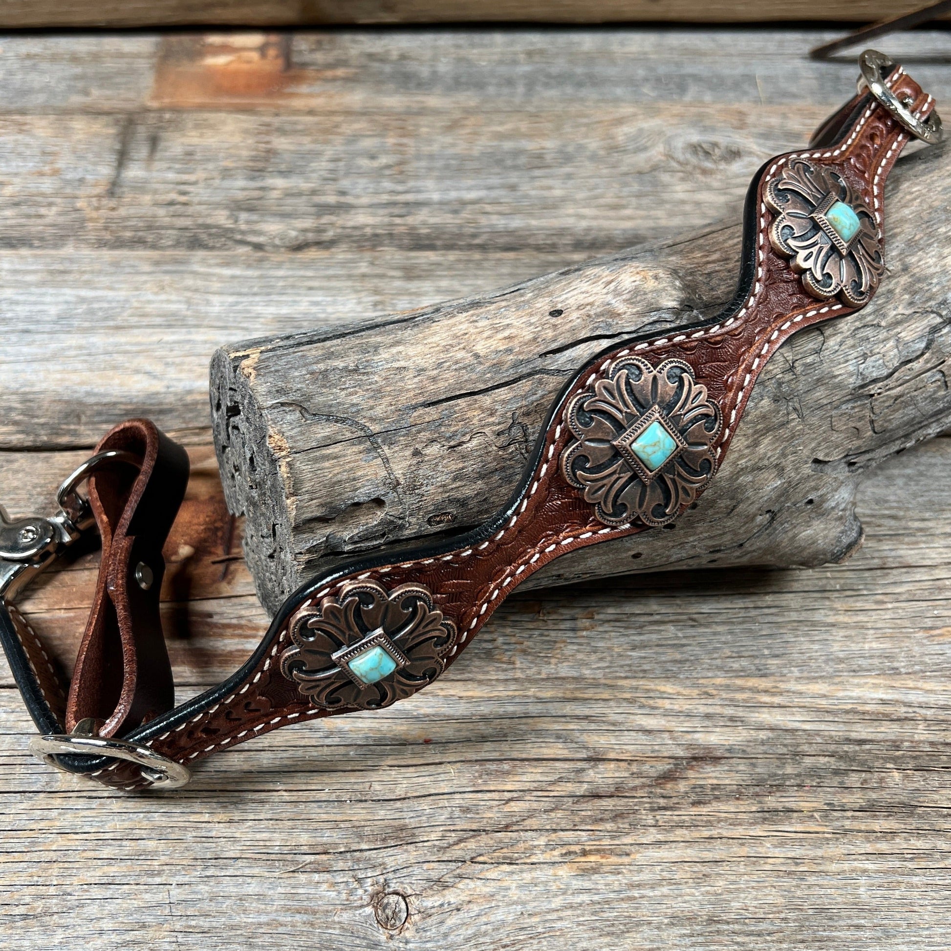 Decorated with copper Fleur De Lis turquoise conchos.