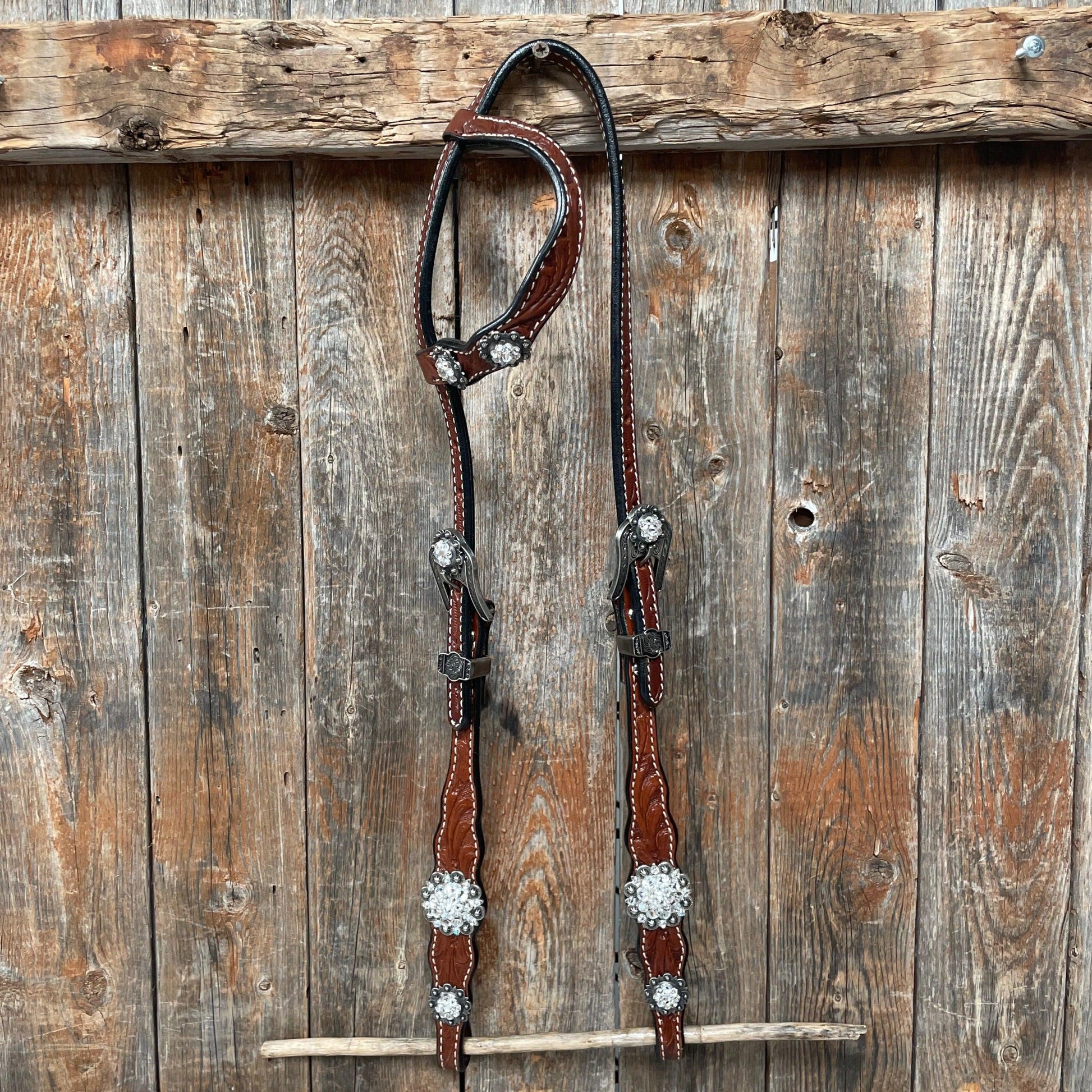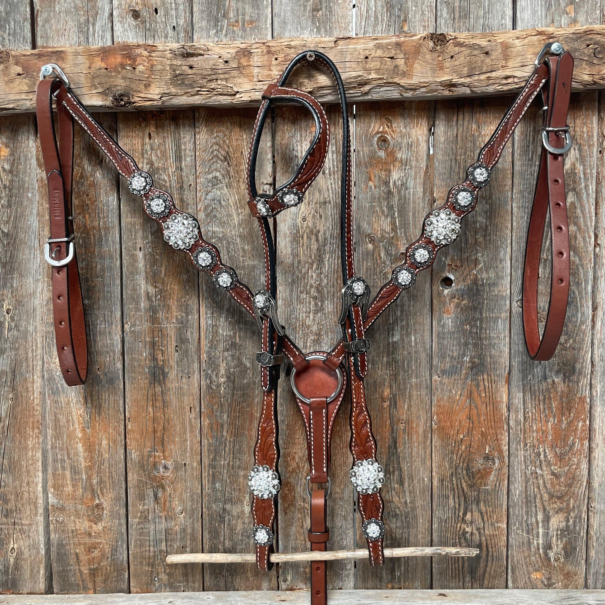 Browband, one ear and breastcollar is medium oil floral scalloped style. They are decorated with antique silver Clear crystal conchos and buckles.