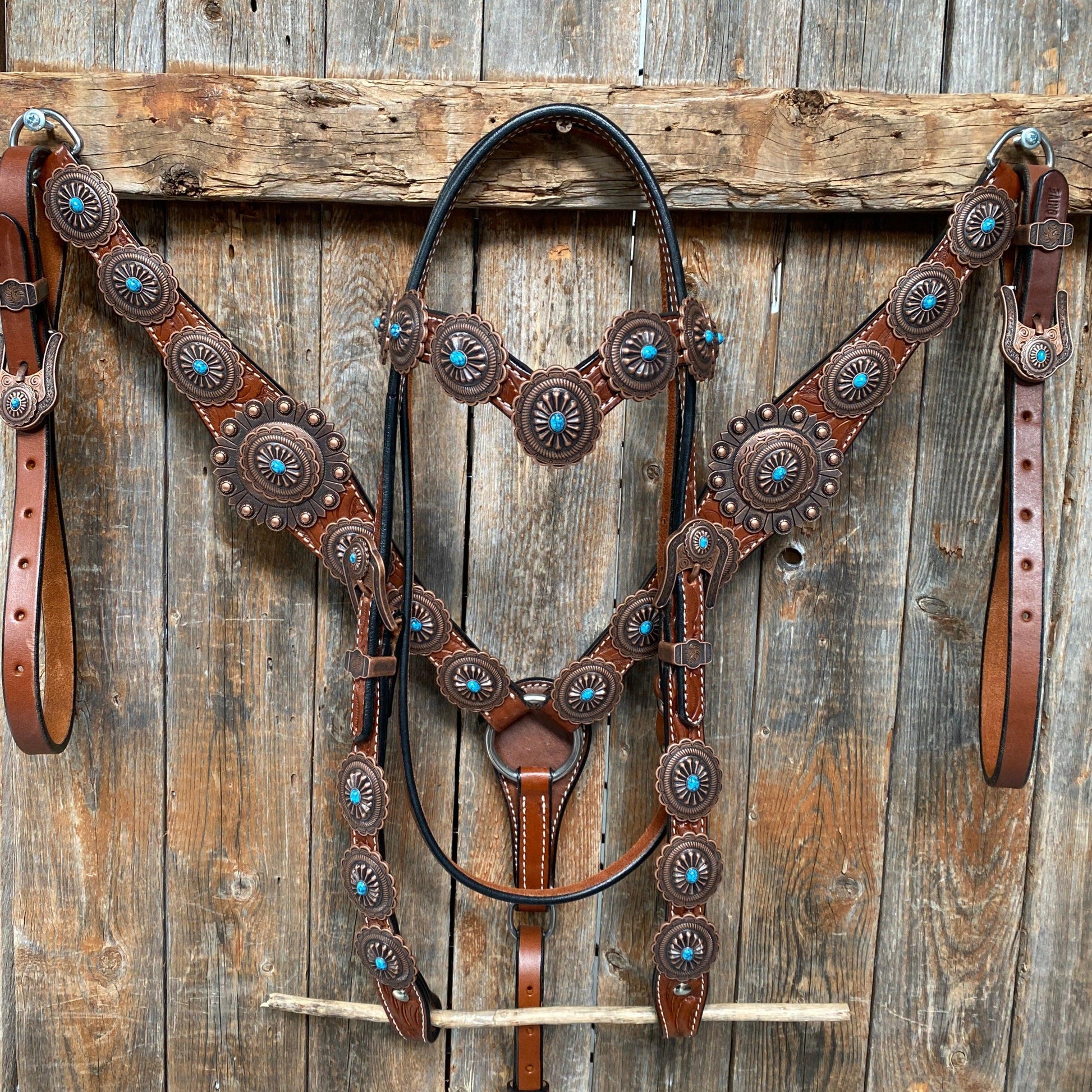 Browband and breastcollar in medium oil floral tooling. They are decorated with copper oval turquoise western conchos (W179).