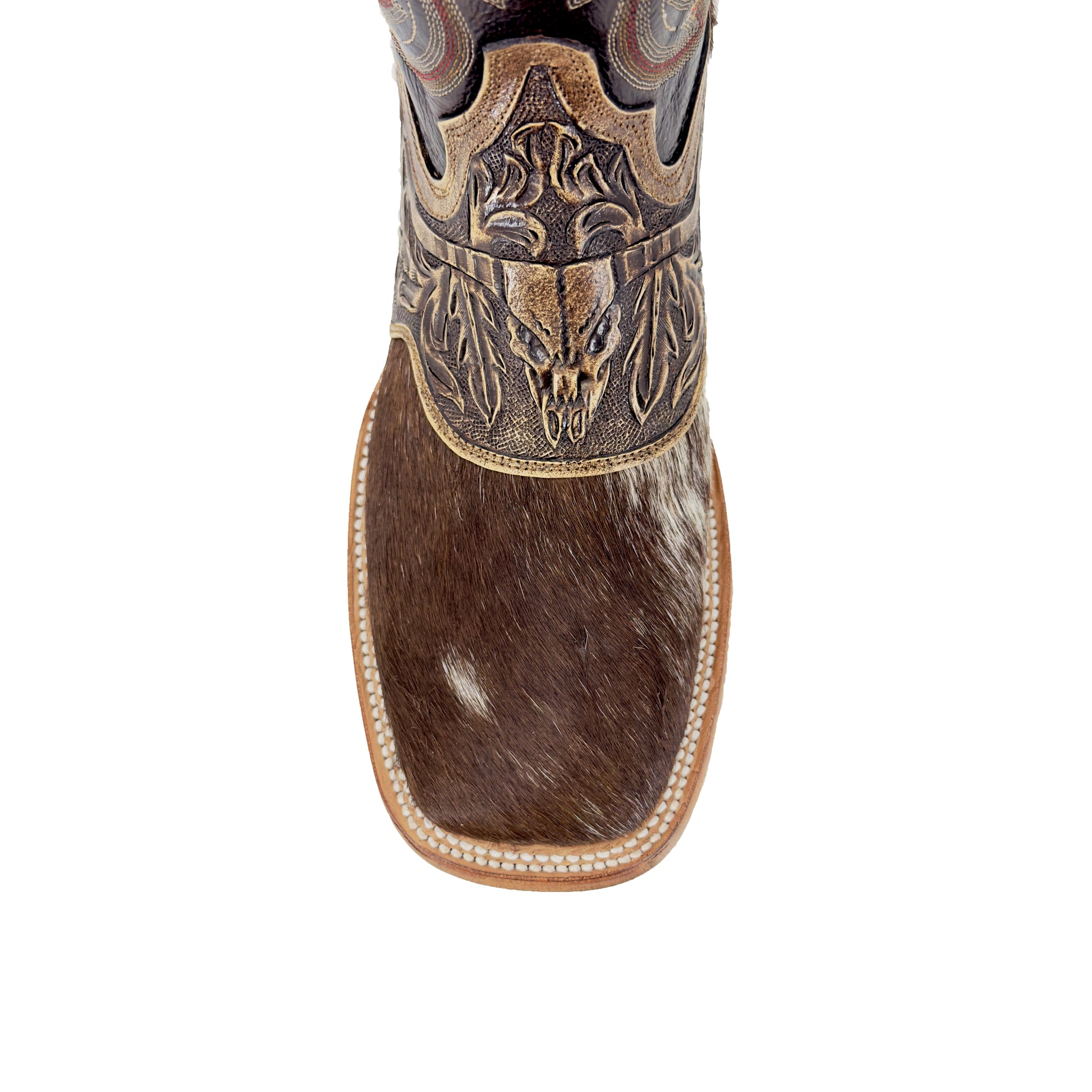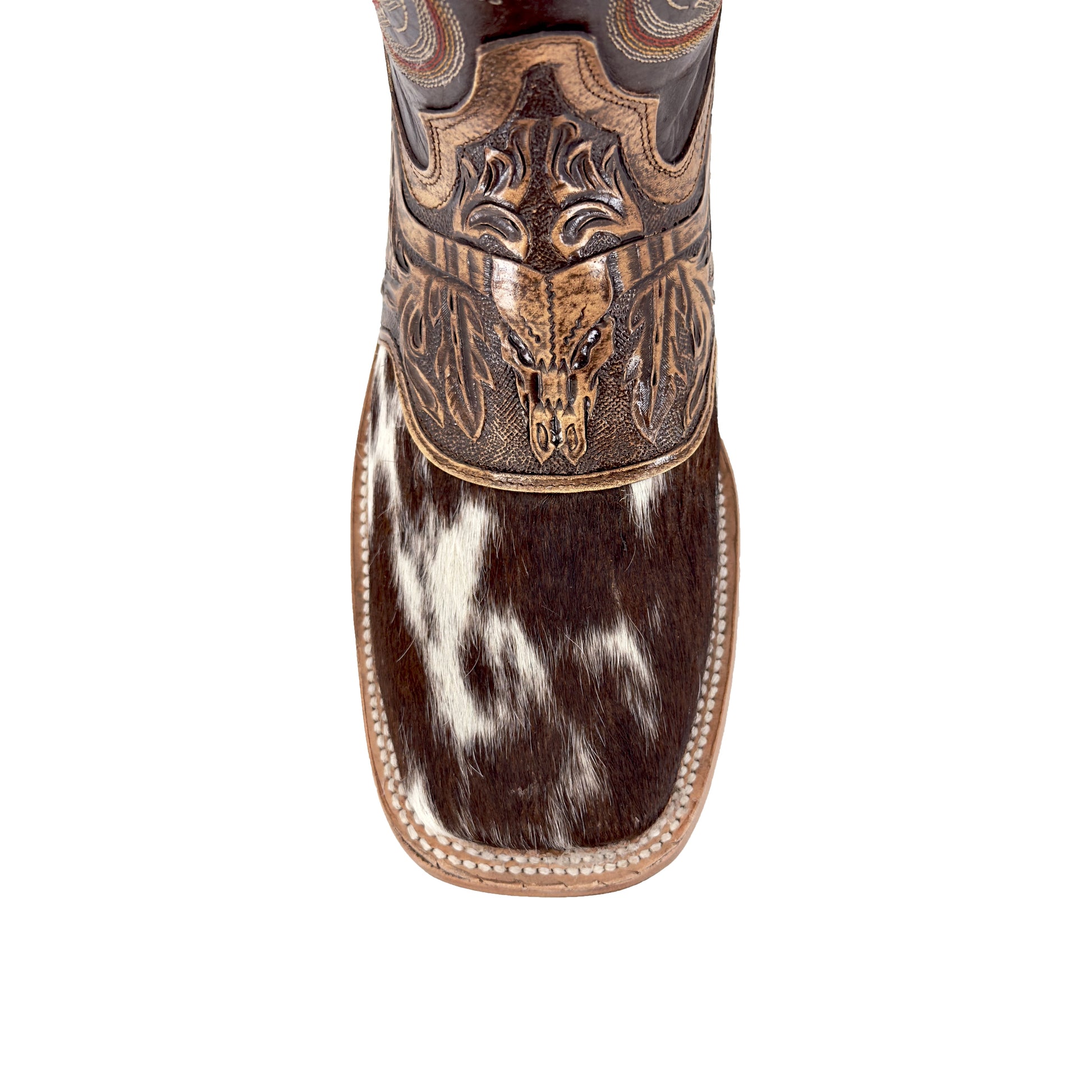 Featuring a hand-tooled bull skull design on the vamp (chinela). The intricate chiseling showcases the rugged spirit of the American West. Crafted with genuine cowhide on the vamp and heel, each pair displays natural patterns, ensuring exclusivity.