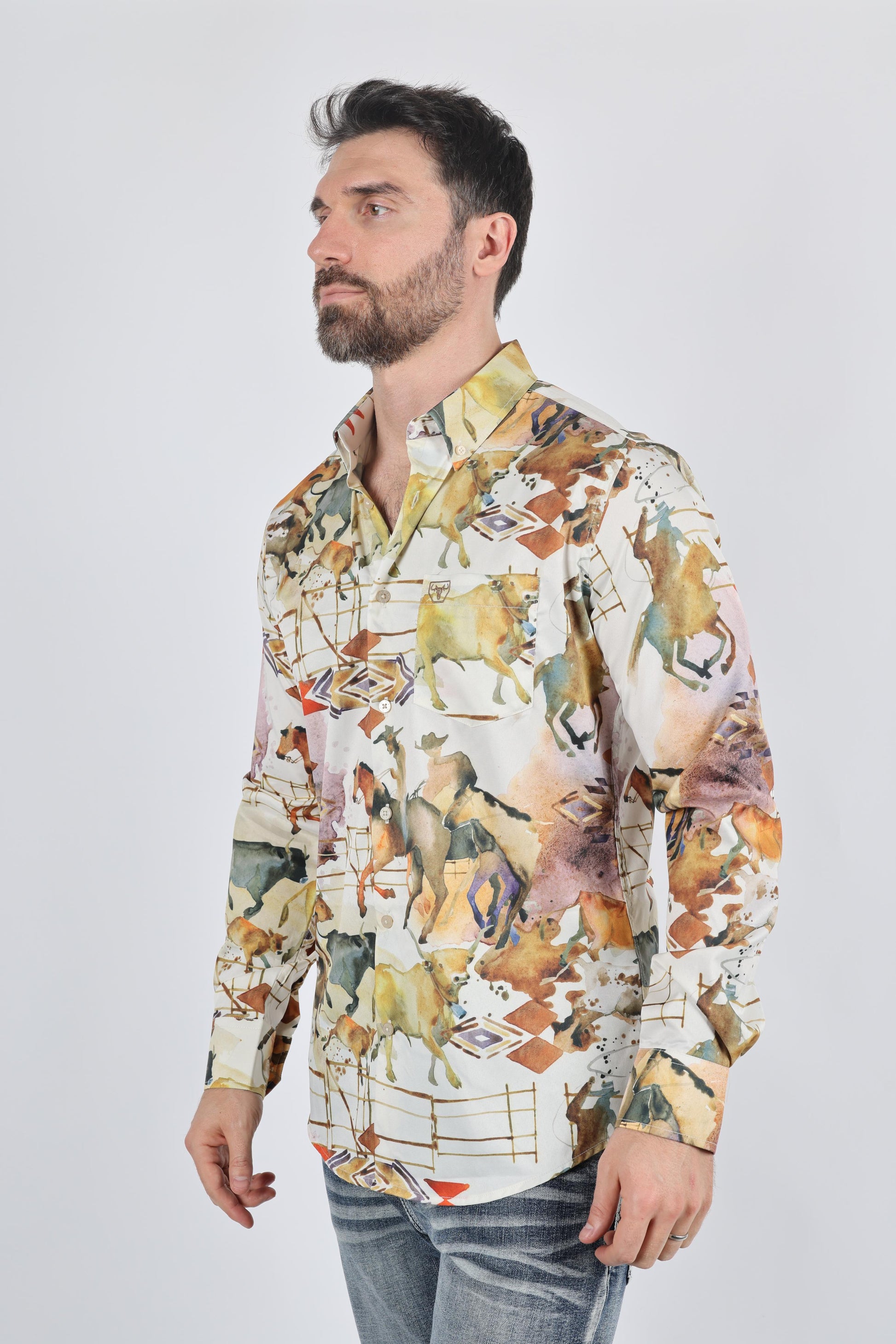 Mens Long Sleeve Modern Fit Stretch Wild Horses Print Shirt