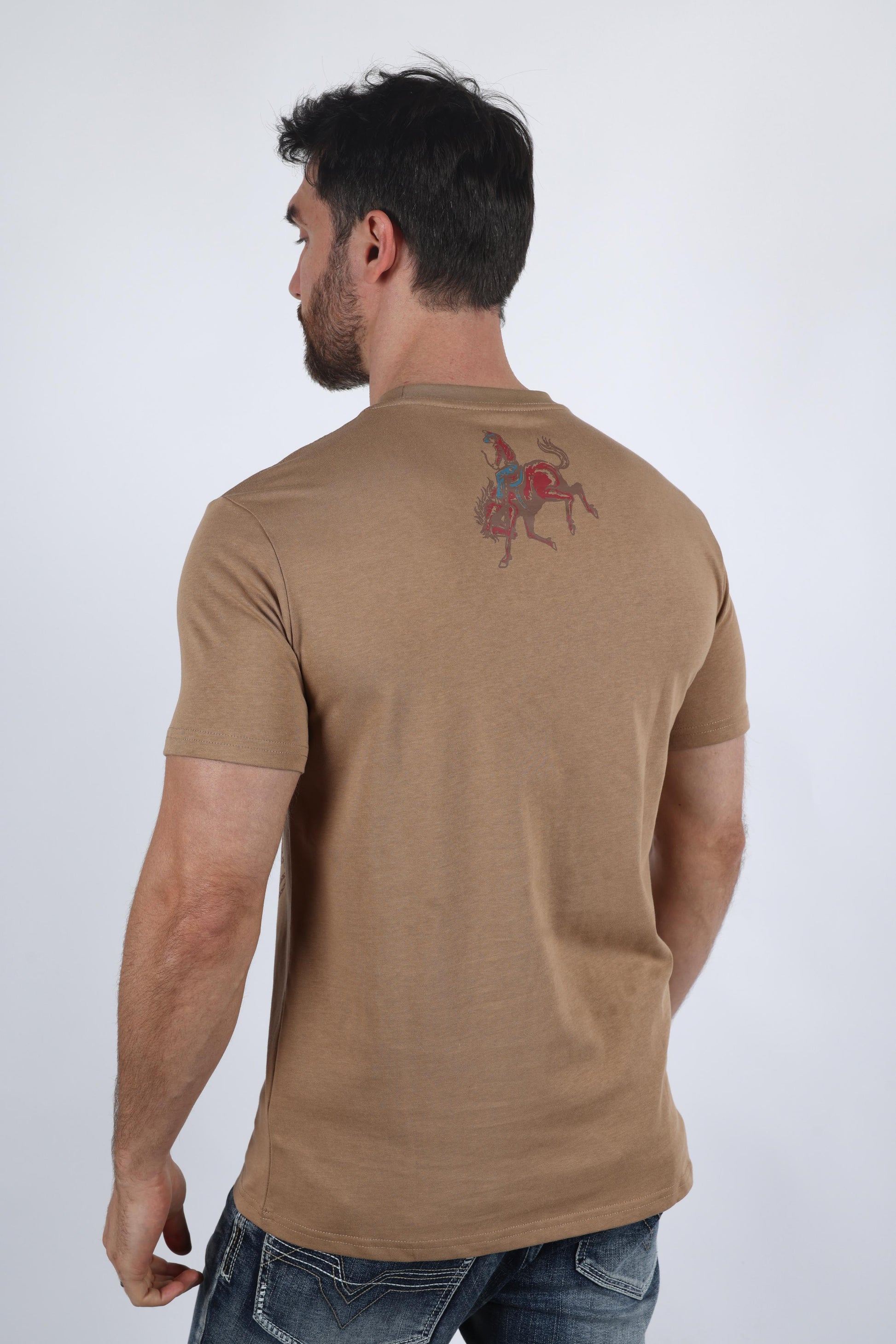 How to Wear: Pair this eye-catching tee with your favorite jeans or chinos for a laid-back yet stylish look. Layer it under a denim jacket or flannel shirt for added warmth and dimension. Whether you're running errands or meeting up with friends, this horse-rider print tee is sure to make a statement.