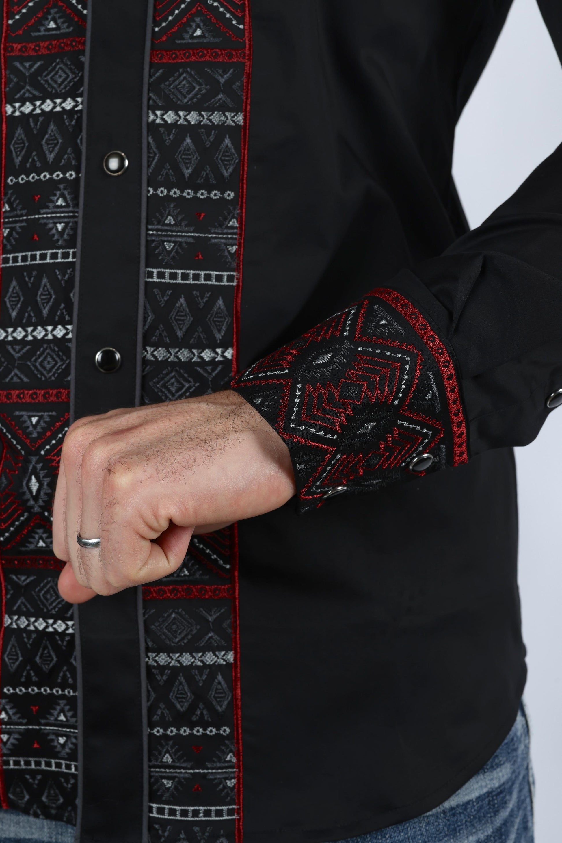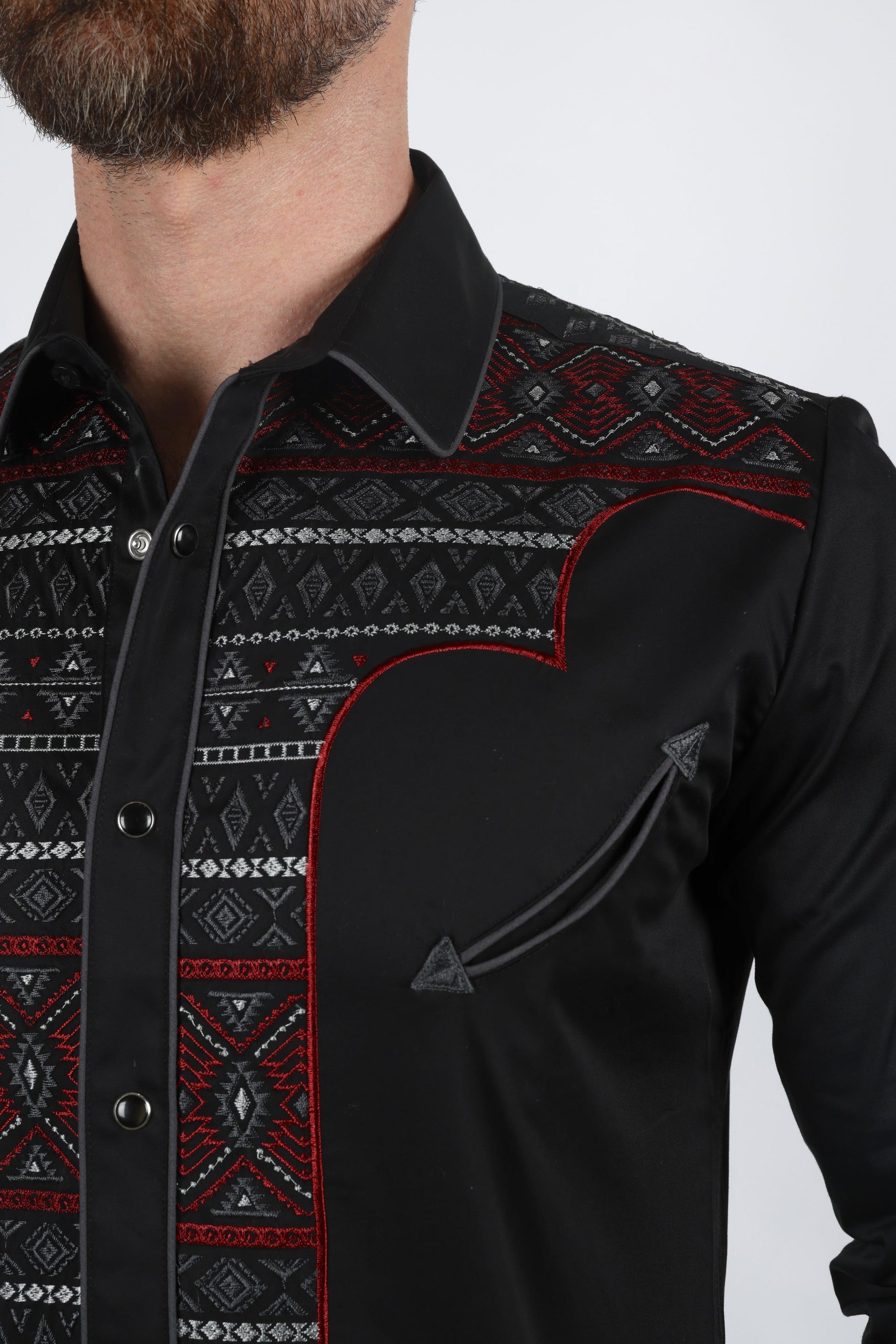 Description: Elevate your style with our Men's Modern Fit Stretch Multi-Color Aztec Embroidery Shirt, featuring exquisite embroidery that runs from the upper back, connecting to the shoulders, and linearly down the front beside the buttons. This black shirt boasts curved arrow details, adding a captivating touch to your ensemble.