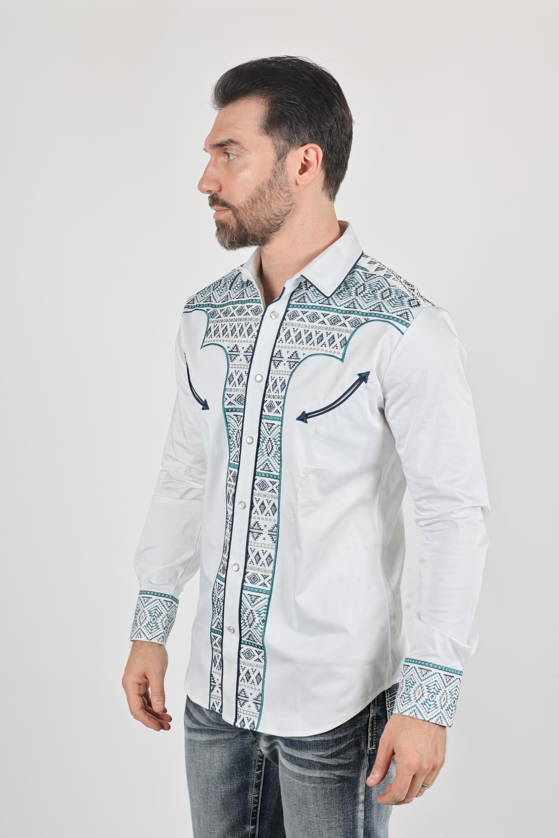 Mens Modern Fit Stretch Multi-Color Aztec Embroidery Shirt