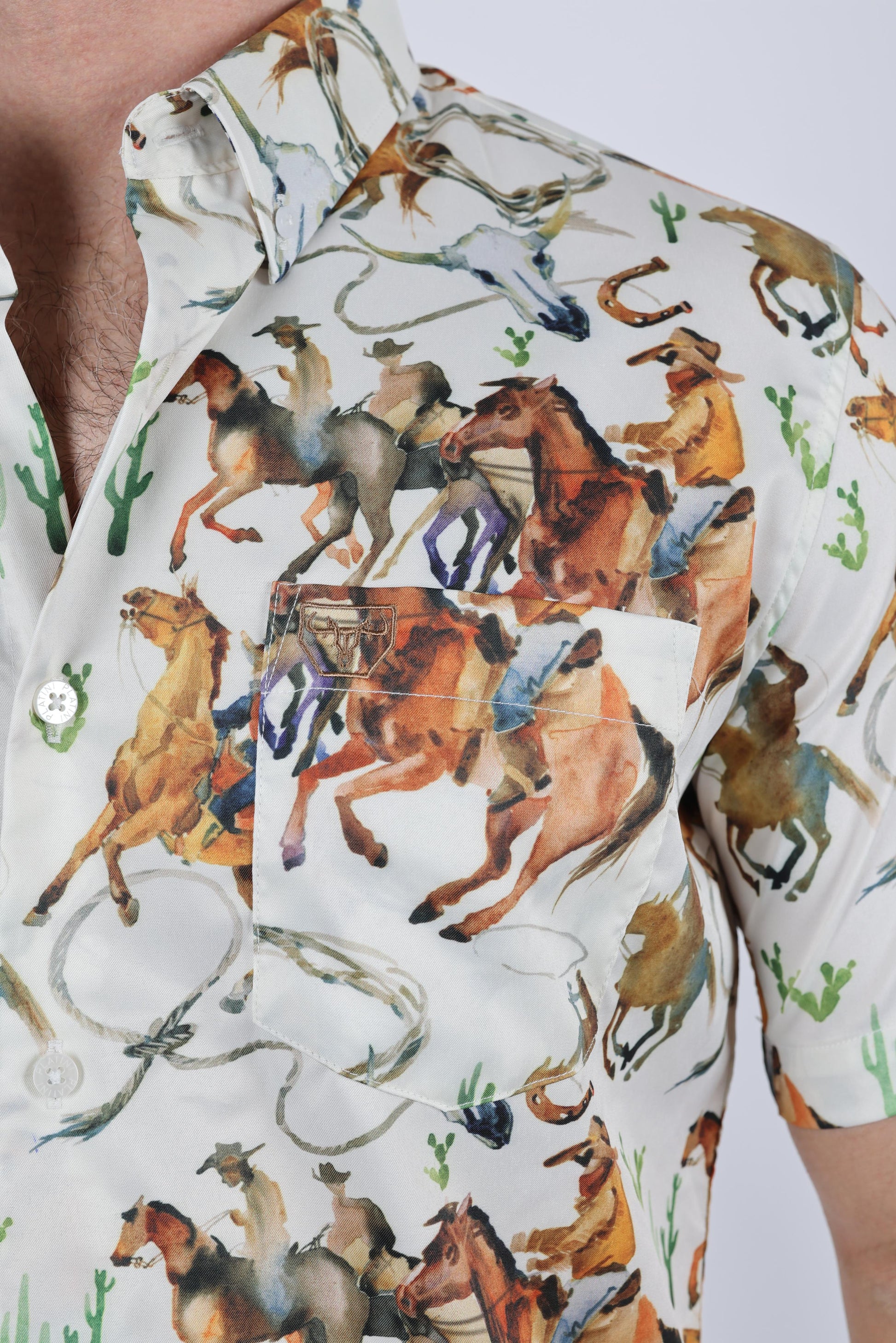 Mens Short Sleeve Modern Fit Stretch Wild Horses Print Shirt
