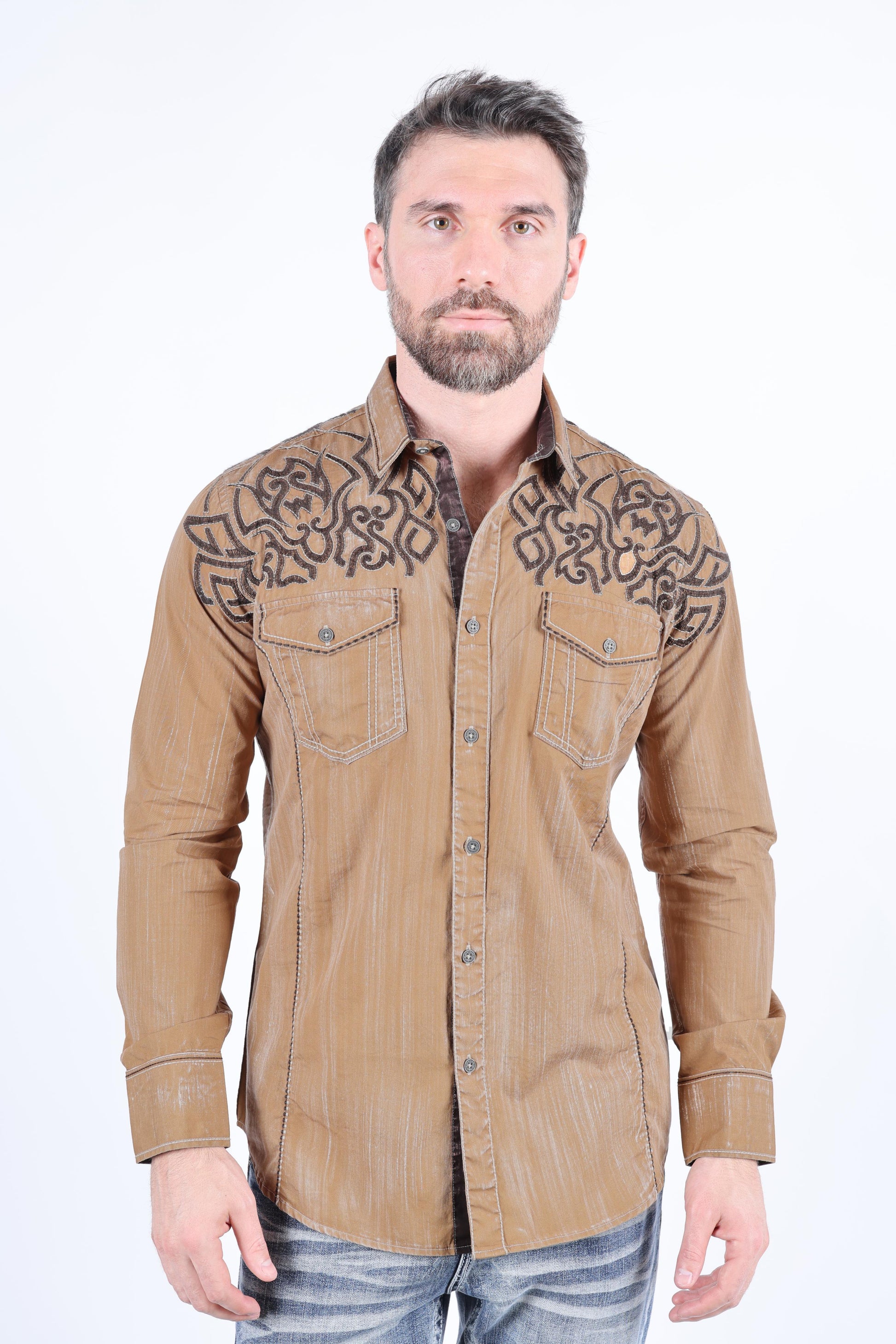 Mens Vintage Washed 2-tone Embroidery Modern Fit Stretch Shirt