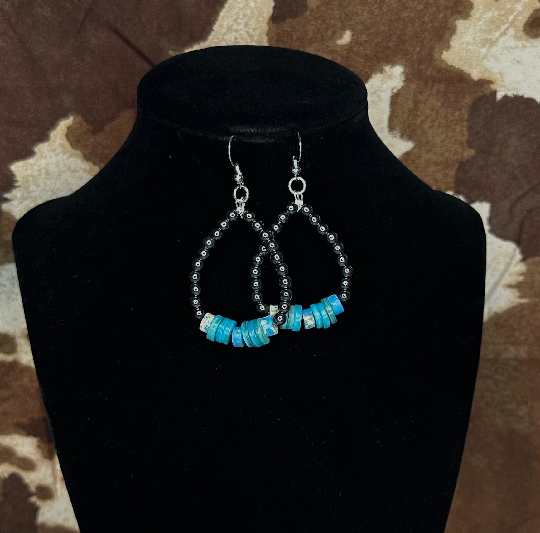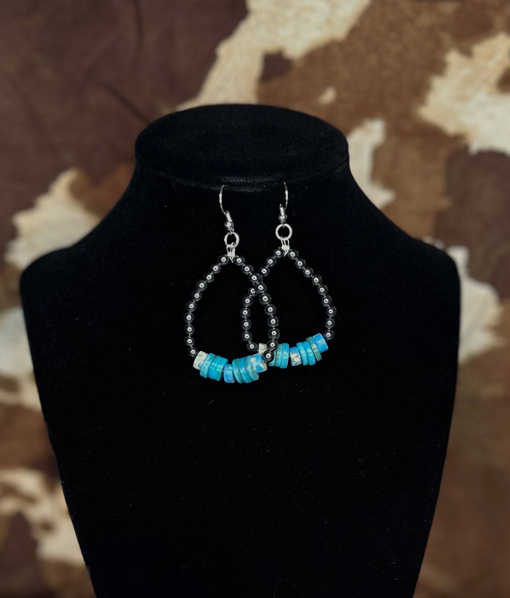 Add a pop of color to your outfit with these handcrafted Moonlight Mesa Earrings. Featuring vibrant turquoise disc beads paired with sleek dark silver spacers, these teardrop-shaped earrings bring a perfect balance of bold and understated style. Lightweight and comfortable, they’re ideal for everyday wear or special occasions, effortlessly complementing both casual and western-inspired looks.