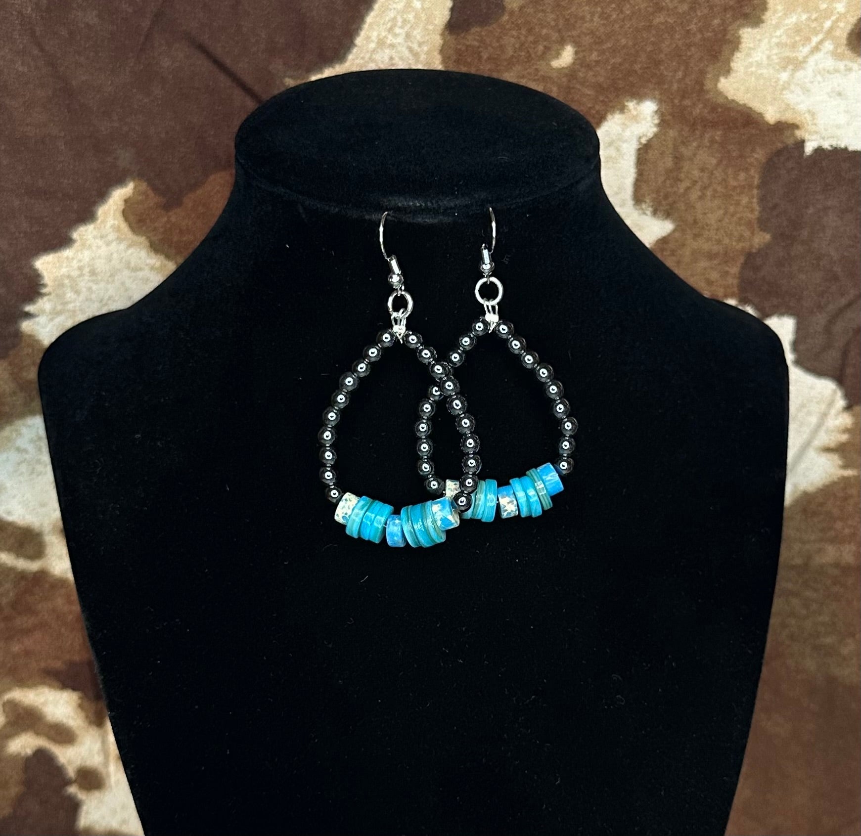 - Teardrop shape with turquoise disc beads and dark silver spacers