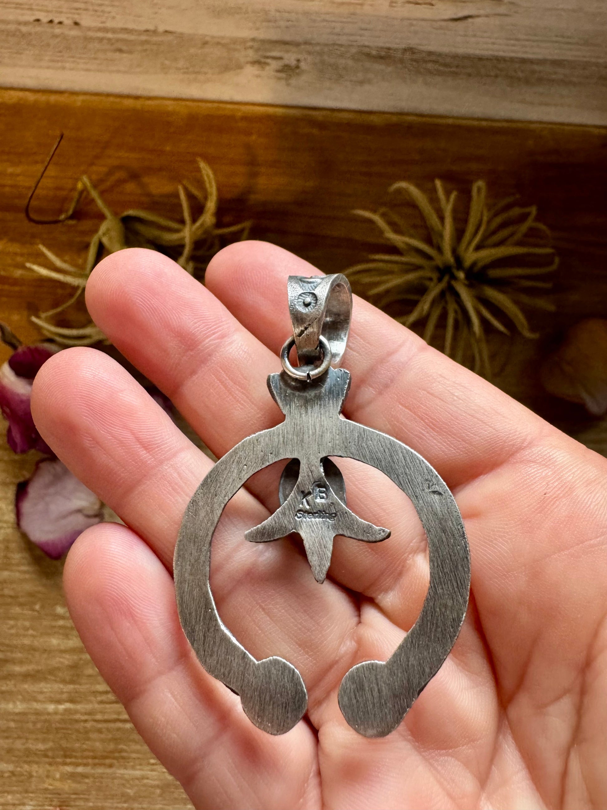 Handmade in the USA, this sterling silver Naja pendant features detailed silverwork with a genuine Golden Hill turquoise stone set in the center. Stamped KB for authenticity, it is crafted with traditional Native artistry. The bail fits up to 8mm pearls, making it perfect for pairing with a sterling silver pearl strand or layering with other turquoise jewelry.
